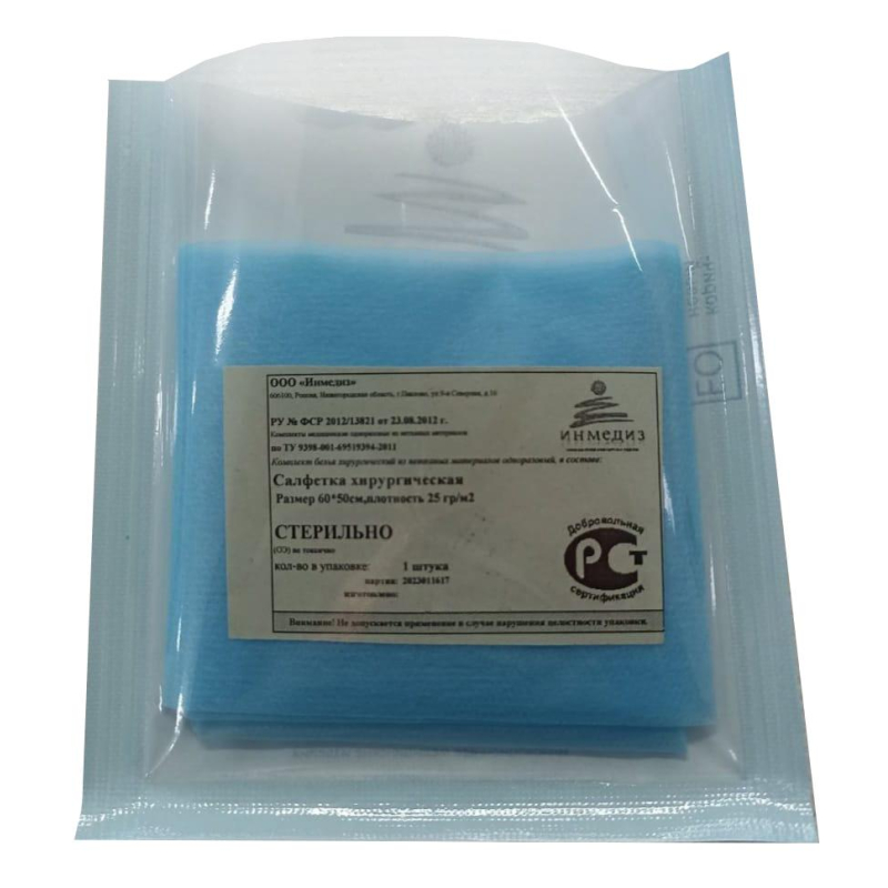 Салфетка хирургическая, стерильная. Изготовлена из комбинированного 3-х слойного нетканого материала: внешние слои - спанбонд, водоотталкивающие слои, внутренний - мельтблаун, водостойкие слои, бактериальный барьер, повышает прочность. Размер 60х50 см. Плотность 25 г/кв.м. Упаковка комбинированная, легко открывается без помощи ножниц, содержит цветовой индикатор стерильности. Изделие соответствует стандарту ГОСТ ЕN 13795-2011.