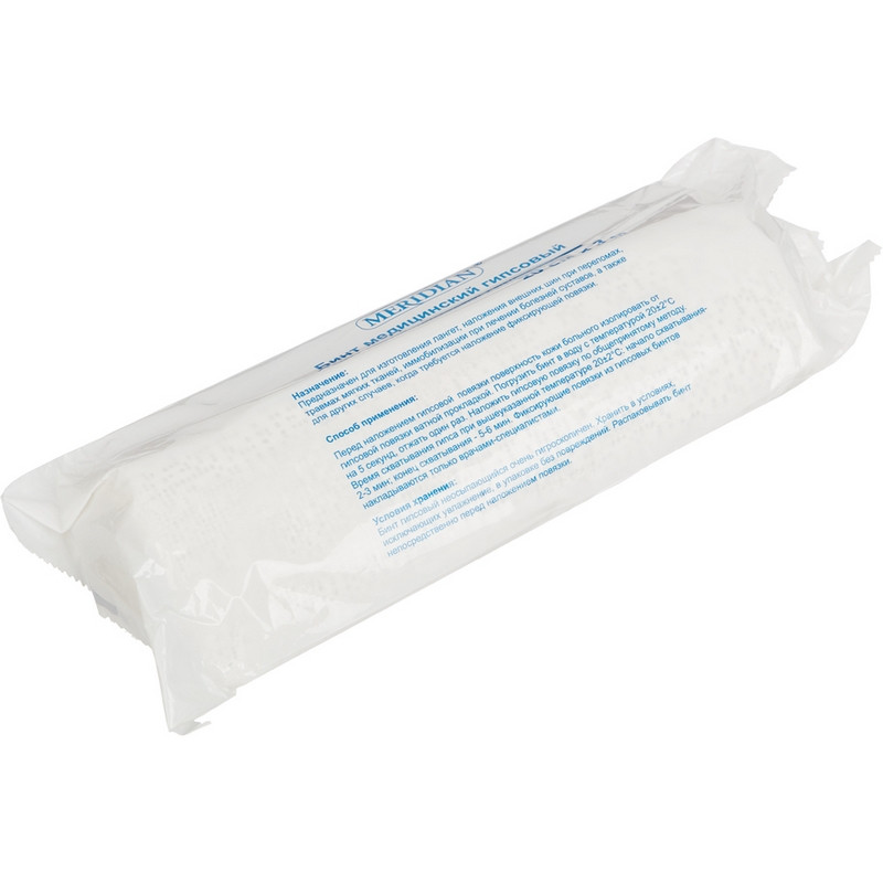Бинт медицинский гипсовый Меридиан. Хлопковые марлевые повязки пропитывают сухим сульфатом кальция и клеевым составом. Повязки представляют собой единый рулон марлевой выбеленной ткани, без стыков и разрывов. Изготовлен из высококачественных сортов гипса, что исключает аллергические реакции кожи; хорошо пропускают рентгеновское излучение, позволяя получать снимки высокого качества. Предназначен для изготовления лангет, наложения внешних шин при переломах, травмах мягких тканей, иммобилизации при лечении болезней суставов и т.д. Время начала схватывания: 2-3 минуты. Конец схватывания: 5-6 минут. Размерный ряд: 10 см х 3 м, 15 см х 3 м, 20 см х 3 м. Упаковка: полиэтилен. Срок хранения: 3 года с даты выпуска.