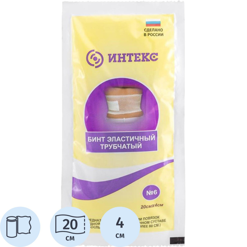 Бинт №6 трубчатый 'ИНТЕКС' используют для фиксации повязок. Бинты обладают хорошей эластичностью, поэтому растягиваются до нужных размеров и надежно обхватывают место перевязки. Индивидуальная упаковка бинтов 'ИНТЕКС' изготавливается из пленки ПВХ и содержит маркировку на каждой штуке, упаковка водостойкая и защищает бинты от повреждений при транспортировке и хранении. 1 упаковка включает в себя 20 штучных бинтов. Бинт № 6 предназначен для фиксации сухих и влажных повязок на грудной клетке и тазобедренном суставе взрослых. По всей длине бинтов №6 нанесена маркерная полоса бежевого цвета, которая предназначена для правильной ориентации бинта по оси при наложении его на тело, с целью предотвращения перекручивания бинтов при их использовании. ПОРЯДОК ИСПОЛЬЗОВАНИЯ: Перед вскрытием убедитесь, что срок годности трубчатого бинта №6 не просрочен, если срок годности хороший - вскройте разовую упаковку. Достаньте из упаковки трубчатый бинт 'ИНТЕКС' №6 и аккуратно натяните его на место, где закреплена фиксируемая салфетка или повязка. После чего, займитесь распределением трубчатого бинта №6 по окружности места травмы так, чтобы осевые нити сетки были прямыми. Следите за маркерной полосой на поверхности бинта, она не должна перекручиваться.