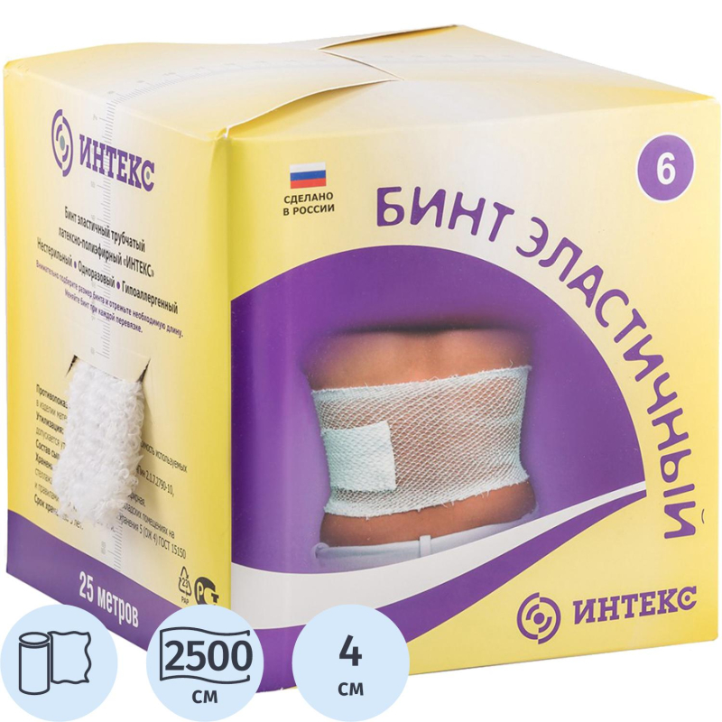 Трубчатые бинты №6 'ИНТЕКС' длиной 3 метра обладают хорошей растяжимостью, они надежно облегают все части тела, не мешают кровообращению и не ограничивают движения в суставах. Бинты №6 обладают хорошим воздухообменом, прочные, сохраняют свои эластические свойства после стирки и не распускаются после надрезания. Применяя трубчатые бинты 'ИНТЕКС' №6 по 3м можно сэкономить перевязочный материал и выиграть время на наложении повязок для фиксации, который заметно упрощается. Трубчатые бинты №6 'ИНТЕКС' производятся длиной по 3 метра и 25 метров, упакованы в картонную упаковку квадратной формы с отверстием, что очень удобно при использовании бинта. Для дополнительного удобства на упаковке нанесена линейка, которая позволяет отрезать бинт нужного размера. Бинт № 6 предназначен для фиксации сухих и влажных повязок на грудной клетке и тазобедренном суставе взрослых. По всей длине бинта №6 длиной 3 метра нанесена маркерная полоса бежевого цвета, которая предназначена для правильной ориентации бинта по оси при наложении его на тело, с целью предотвращения перекручивания бинтов при их использовании.