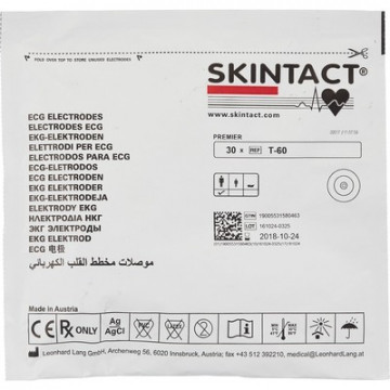 Электрод одноразовый Skintact Т-60 диаметр 60 мм применяются в условиях медицинских учреждений при длительном наблюдении и диагнозе. Используется особо прочный клей для надежного прилипания и фиксации на теле пациента. Масса электродов не более 1,7 г! Разность электродных потенциалов наводки артефактов не более 10 мВ! Полное сопротивление электрода не более 500 Ом! Пакет 30 штук. Материал носителя - высококачественный нетканый материал микропористая лента обеспечивает активное дыхание кожи, не вызывающий аллергических реакций с прочным клеем для надежного прилипания. Жидкий гель Aqua Wet длительного действия фирмы Leonhard Lang GmbH (Австрия) пропитанный в губку из мелкоячеистого поролона высокого давления. Элемент датчика - хлорид серебра, обеспечивает безупречное отведение токов сердца. Одноразовый универсальный электрод Skintact T-60 отличается: - не вызывает раздражений и аллергии, - обеспечивает отличное качество получаемых сигналов, - электрод прост в использовании, - расходный материал снабжен нержавеющими клеммами, - габариты пластины - диаметр 60 мм.