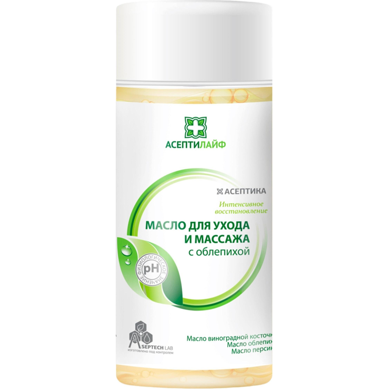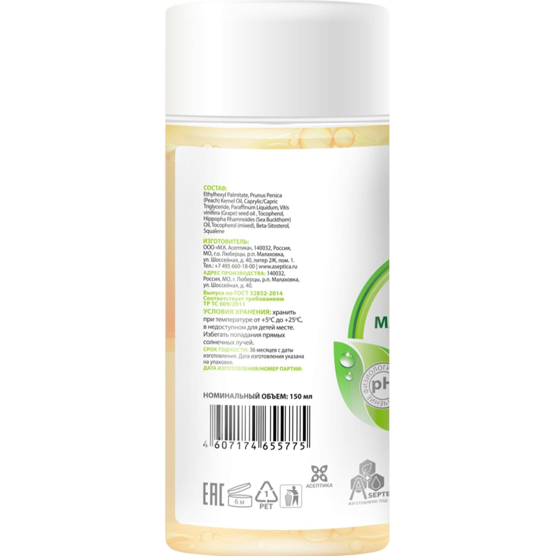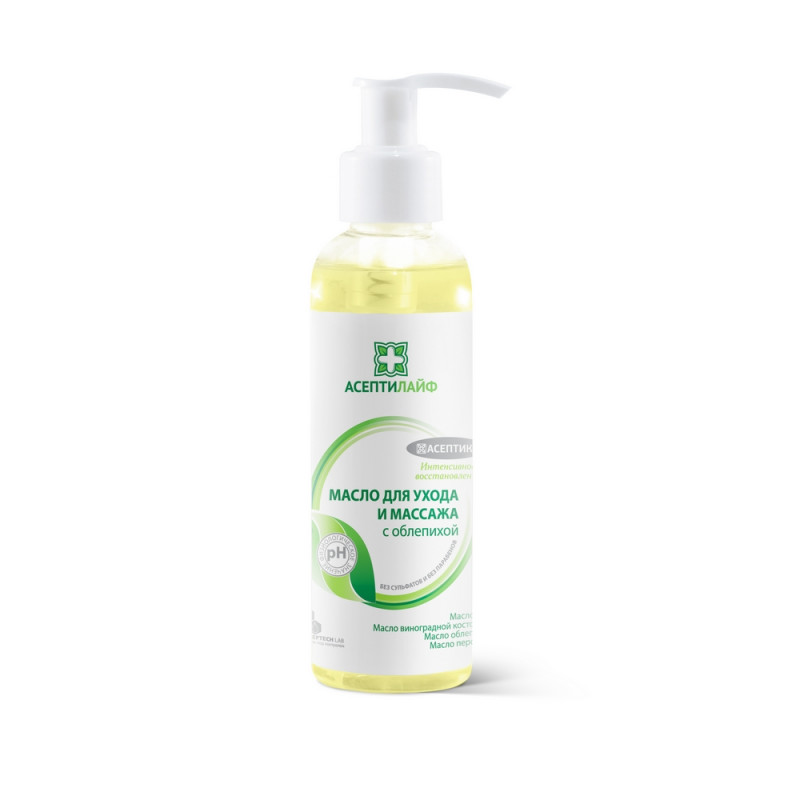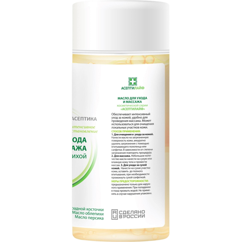 Обеспечивает интенсивный уход за кожей, удобно для проведения массажа. Может использоваться для очищения локальных участков кожи. Сохраняет увлажненность кожи. Защищает от свободных радикалов. Состав: Ethylhexyl Palmitate, Prunus Persica (Peach) Kernel Oil, Caprylic/Capric Triglyceride, Paraffinum Liquidum (EU) / Mineral Oil, Vitis Vinifera (Grape) Seed Oil, Tocopherol, Glyceryl Laurate, Phenoxyethanol, Hippophae Rhamnoides (Sea Buckthorn) Oil. Форма выпуска: флакон с дозатором - 150 мл. Способы применения: 1. для очищения и ухода за кожей: нанести масло на загрязненную поверхность кожи, аккуратно удалить загрязнения с помощью впитывающего полотенца или салфетки. В зависимости от степени загрязнения повторить процедуру. 2. для массажа: небольшое количество масла нанести на сухую или влажную кожу тела и провести массаж. 3. для ухода за сухой кожей: нанести на сухие участи кожи, оставить до полного впитывания, при необходимости промокнуть сухой салфеткой. Меры предосторожности: предназначено только для наружного применения. При попадании в глаза промыть водой. Не применять в случае нарушения упаковки. Рекомендуется использовать для ухода за кожей маломобильных пациентов.