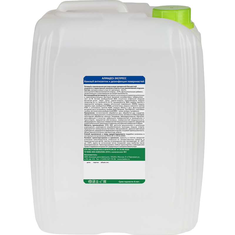 Антисептик кожный спрей 'Алмадез Экспресс' спиртовой 5 л. Химический состав средства: ЧАС, спирты, вспомогательные компоненты. Действующие вещества: алкилдиметилбензиламмоний хлорид (АДБАХ) 0.1 %, изопропиловый спирт (пропанол-2) 63.5 %, вспомогательные компоненты. Сфера применения: акушерские стационары, ЛПУ, клинические лаборатории, бактериологические лаборатории, детские учреждения (детсады, школы и т.п.), пенитенциарные учреждения, предприятия общественного питания, предприятия продовольственной торговли, потребительские рынки, коммунальные объекты (бани, бассейны, гостиницы, общественные туалеты и т.п.), учреждения соцобеспечения, парикмахерские, санитарный транспорт, отделения неонатологии, в быту населением, предприятия фармацевтической промышленности, аптеки, учреждения культуры, отдыха (кинотеатры, музеи, театры), спортивные и культурно-оздоровительные комплексы, объекты курортологии, вирусологические лаборатории. Объекты обработки: гигиеническая обработка рук, обработка инъекционного поля, обработка кожи ног для профилактики грибковой инфекции, обработка локтевых сгибов доноров, обработка операционного поля, обработка рук операционных медицинских сестер, акушерок и других лиц, участвующих в операциях и приеме родов, обработка рук хирургов, перчатки (из каучука, латекса, неопрена и т.д.), поверхности в помещениях, поверхности приборов и аппаратов. Класс опасности: при введении в желудок - 4; при нанесении на кожу - 4; рабочего раствора - 4. Активно в отношении: бактерии (Mycobacterium tuberculosi, возбудители ВБИ, грамотрицательные бактерии, грамположительные бактерии), вирусы (атипичной пневмонии, ВИЧ, герпеса, грипп, парентеральных гепатитов, полиомиелит, птичьего гриппа (H5N1), свиной грипп (H1N1), энтеральных гепатитов), патогенные грибы (дерматофитон, кандида). Срок годности: 5 лет. Страна производства: Россия.