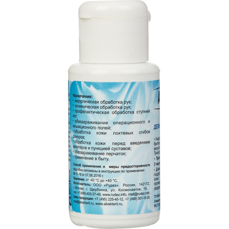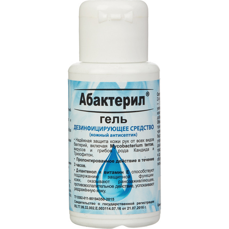 Антисептик кожный Абактерил-гель (50 мл) представляет собой готовый к применению кожный антисептик в виде бесцветного прозрачного геля на водно-спиртовой основе с характерным спиртовым запахом и/или запахом применяемой отдушки. Состав: в качестве действующих веществ (ДВ) содержит: спирт изопропиловый - 60,0%, 2-феноксиэтанол - 1%, 2,4,4-трихлоро-2-гидроксидифенил эфир (триклозан) - 0,25%, также средство содержит другие функциональные добавки, в том числе увлажняющие и ухаживающие за кожей компоненты. В качестве увлажняющих и ухаживающих за кожей добавок содержит Д-пантенол и витамин Е. Антимикробная активность дезинфицирующего средства ?Абактерил-гель?: в отношении грамположительных (включая микобактерии туберкулеза - тестировано на Mycobacterium terrae) и грамотрицательных бактерий, вирусов (включая рино-, норо-, рото-, адено-вирусы: вирусы энтеральных и парентеральных гепатитов, полиомиелита, ВИЧ- инфекцию, вирусов гриппа и парагриппа человека, вирусов ?свиного? гриппа H1N1 и ?птичьего? гриппа H5N1, вирусов ?атипичной пневмонии? (SARS), вирусов герпеса), грибов рода Кандида и Трихофитон. Средство обладает пролонгированным действием в течение 3 часов. Преимущества дезинфицирующего средства ?Абактерил-гель?: - гелевая форма антисептика по сравнению с жидким антисептиком более удобна в применении. Не стекает с рук в отличие от жидких антисептиков. Благодаря этому, гель более экономичен в применении; - гелевая форма антисептика обладает менее выраженным запахом изопропилового спирта; - быстро высыхает, не оставляет ощущения липкости; - в качестве увлажняющих и ухаживающих за кожей добавок содержит Д-пантенол и витамин Е, которые способствуют поддержанию защитной функции кожи; оказывают ранозаживляющее, противовоспалительное действие, успокаивают раздраженную кожу; - наличие компактных флаконов для индивидуального пользования позволяют носить антисептик с собой и поддерживать гигиену рук в любой ситуации, когда вода и мыло не доступны. Хранение и транспортировка дезинфицирующего средства ?Абактерил-гель?: транспортировка средства возможна всеми видами транспорта в соответствии с правилами перевозки легковоспламеняющихся жидкостей, содержащих изопропиловый спирт, действующими на данном виде транспорта и гарантирующими сохранность средства и тары. Хранить отдельно от лекарственных средств, в местах, недоступных детям, при температуре от -40 °С до +40 °С. Срок годности: 6 лет со дня изготовления в невскрытой упаковке изготовителя. Токсичность и безопасность дезинфицирующего средства ?Абактерил-гель?: по параметрам острой токсичности при введении в желудок и нанесении на кожу, согласно ГОСТ 12.1.007-76, относится к 4 классу мало опасных веществ. Местно-раздражающие, кожно-резорбтивные и сенсибилизирующие свойства в рекомендованных режимах применения у средства не выражены. Средство обладает выраженным раздражающим действием на оболочки глаз.