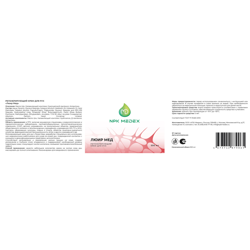 Профессиональный крем для ухода за кожей рук. Рекомендован для использования работниками ЛПУ, медицинского персонала при частой обработке рук. Обладает антимикробными свойствами, тестировано на Escherichia coli, Pseudomonas aeruginosa, Staphylococcus aureus, Candida albicans, мезофильные аэробные и факультотивно-анаэробные микроорганизмы. В состав крема входит противомикробный компонент, глицерин, масло ши, силикон, Д-пантенол, этилпарабен, карбопол, аллантоин, гидроксид натрия, отдушка и др. компоненты. Предназначен для повседневного ухода за кожей рук после контакта с чистящими, моющими и дезинфицирующими средствами. Крем обладает противовоспалительным и ранозаживляющим эффектом, способствует снятию раздражения и покраснения кожи, оказывает успокаивающее действие, способствует быстрой регенерации кожи, увлажняет и питает кожу рук.