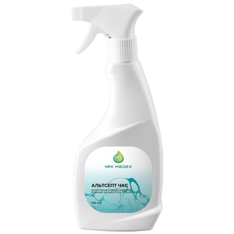 Антисептик кожный спрей ?Альтсепт? спиртовой 500 мл. Химический состав средства: гуанидин, спирты, вспомогательные компоненты. Действующие вещества: N-пропанол (пропанол-1) 20 %, изопропиловый спирт (пропанол-2) 50 %, компоненты, улучающие состояние кожи, хлоргексидина биглюконат 0.5 %, вспомогательные компоненты. Сфера применения: ЛПУ, клинические лаборатории, станции переливания крови, бактериологические лаборатории, детские учреждения (детсады, школы и т.п.), Предприятия общественного питания, предприятия продовольственной торговли, Коммунальные объекты (бани, бассейны, гостиницы, общественные туалеты и т.п.), учреждения соцобеспечения, парикмахерские, косметические и массажные салоны, санитарный транспорт, в быту населением, аптеки, вирусологические лаборатории. Объекты обработки: гигиеническая обработка рук, обработка инъекционного поля, обработка локтевых сгибов доноров, обработка операционного поля, обработка рук операционных медицинских сестер, акушерок и других лиц, участвующих в операциях и приеме родов, обработка рук хирургов, поверхности в помещениях, поверхности приборов и аппаратов. Класс опасности: при введении в желудок - 4; при нанесении на кожу - 4; рабочего раствора - 4. Активно в отношении: бактерии (Mycobacterium tuberculosi, возбудители ВБИ, грамотрицательные бактерии, грамположительные бактерии), вирусы (грипп, парагрипп, прочие возбудители ОРВИ), патогенные грибы (дерматофитон, кандида). Срок годности: 5 лет. Страна производства: Россия.