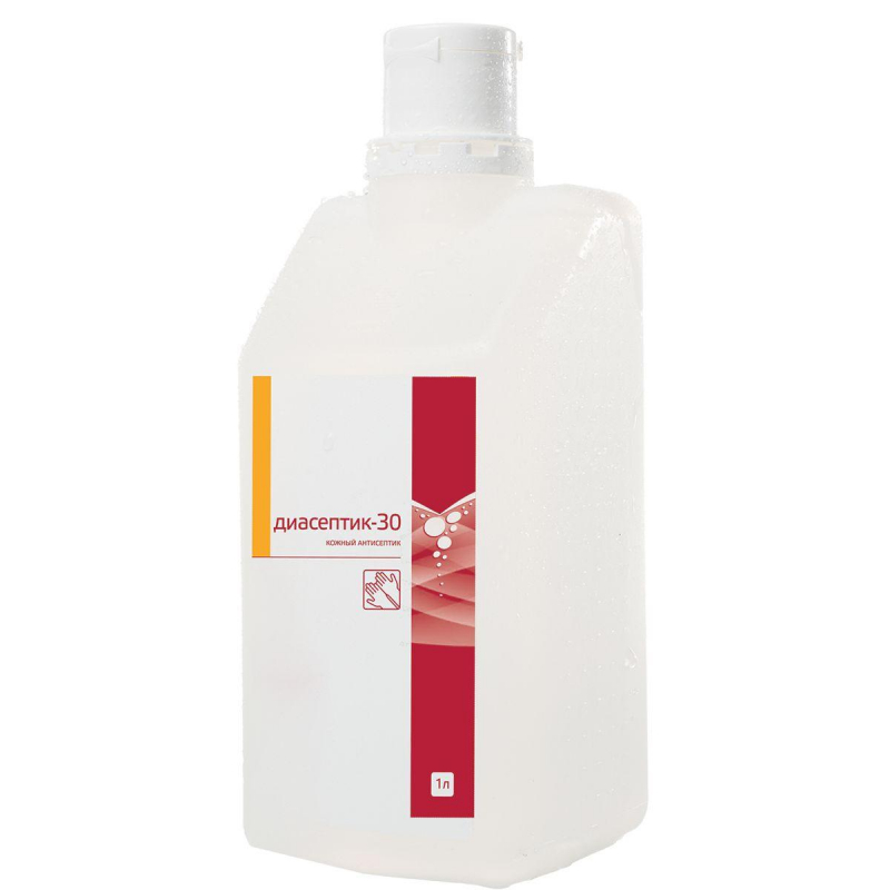 Кожный антисептик ?Диасептик 30? с пониженным содержанием спирта в виде прозрачной бесцветной жидкости. Средство обладает биоцидной активностью в отношении Гр+ и Гр- бактерий, в том числе возбудителей туберкулеза и ВБИ, патогенных грибов - возбудителей дерматофитий и кандидозов, вирусов (включая аденовирусы, вирусы гриппа, парагриппа и др. возбудителей острых респираторных инфекций, энтеровирусы, ротавирусы, вирус полиомиелита, вирусы энтеральных, парентеральных гепатитов, герпеса, ВИЧ, атипичной пневмонии, птичьего гриппа). Состав: изопропанол (пропанол-2) 30%, полигексаметиленбигуанид гидрохлорид 0,25% и функциональные добавки - кондиционер воды, эмульгатор, смягчающие добавки, витамин Е. Средство применяют для гигиенической обработки рук медицинского персонала, обработки рук хирургов, для обеззараживания и обезжиривания кожи операционного и инъекционного полей, локтевых сгибов доноров, а также для обработки кожи перед введением катетеров и пункцией суставов в ЛПУ, для обработки ступней ног после посещения бань, душевых, бассейнов, саун, для обработки обуви с целью профилактики грибковых заболеваний.