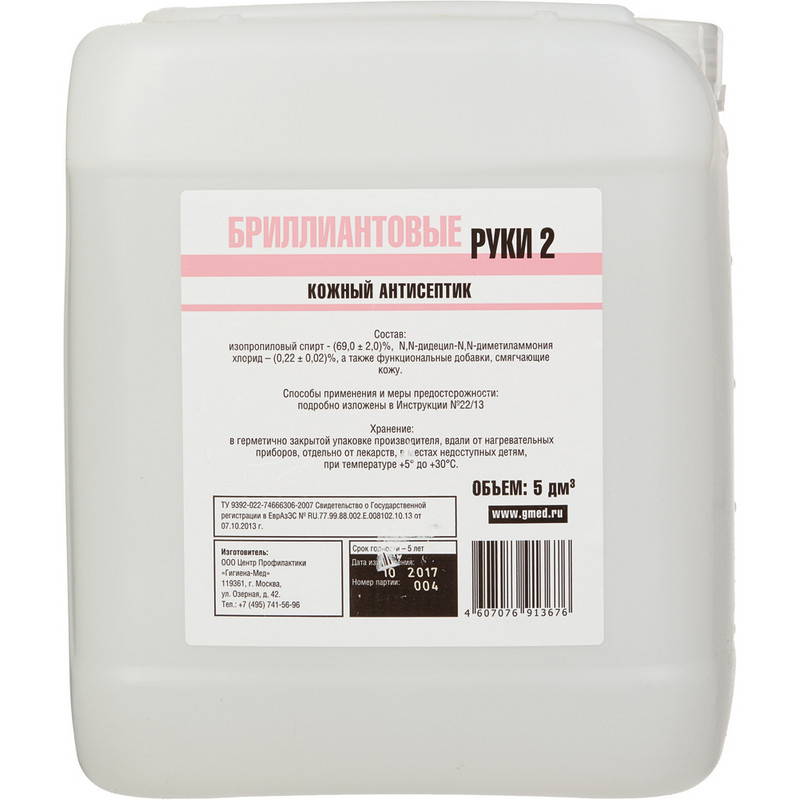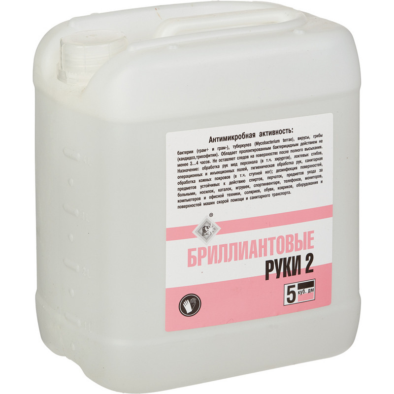 Антисептик кожный 'Бриллиантовые руки-2' спиртовой 5 л. Химический состав средства: ЧАС, спирты, вспомогательные компоненты. Действующие вещества: дидецилдиметиламмоний хлорид 0.22 %, изопропиловый спирт (пропанол-2) 69 %, компоненты, улучающие состояние кожи. Сфера применения: акушерские стационары, ЛПУ, клинические лаборатории, станции переливания крови, бактериологические лаборатории, детские учреждения (детсады, школы и т.п.), пенитенциарные учреждения, инфекционные очаги, предприятия общественного питания, предприятия продовольственной торговли, потребительские рынки, коммунальные объекты (бани, бассейны, гостиницы, общественные туалеты и т.п.), учреждения соцобеспечения, парикмахерские, косметические и (или) массажные салоны, прачечные, ветеринарные и животноводческие объекты, санитарный транспорт, отделения неонатологии, в быту населением, предприятия фармацевтической промышленности, аптеки, отделения физиотерапевтического профиля, спортивные и культурно-оздоровительные комплексы, объекты курортологии, диагностические лаборатории, вирусологические лаборатории, морги и ритуальные учреждения. Объекты обработки: анестезиологическое оборудование, аппараты искуственной вентиляции легких, гигиеническая обработка рук, датчики диагностического оборудования (УЗИ и т.д.), диагностическое оборудование, жесткая мебель, игрушки, кресла гинекологические, стоматологические, кровати, реанимационные матрацы, мягкая мебель, напольные покрытия, обивочные ткани, обработка инъекционного поля, обработка кожи ног для профилактики грибковой инфекции, обработка локтевых сгибов доноров, обработка операционного поля, обработка рук операционных медицинских сестер, акушерок и других лиц, участвующих в операциях и приеме родов, обработка рук хирургов, обувь, осветительное оборудование (бактерицидные лампы и тд), офисная техника (телефонные аппараты, мониторы, компьютерные клавиатуры и др. ), перчатки (из каучука, латекса, неопрена и т.д.), поверхности в помещениях, поверхности приборов и аппаратов, предметные стекла для микроскопии, предметы ухода за больными, радиаторные решетки, насадки, накопители конденсата, резиновые и полипропиленовые коврики, санитарная обработка кожных покровов, санитарная обработка кожных покровов, в том числе у лежачих и тяжелобольных, санитарный транспорт, спортивный инвентарь, столы реанимационные, манипуляционные, пеленальные, стоматологические отсасывающие системы. Класс опасности: при введении в желудок - 4; при нанесении на кожу - 4; рабочего раствора - 4. Активно в отношении: бактерии (Mycobacterium tuberculosi, возбудители ВБИ, грамотрицательные бактерии, грамположительные бактерии), вирусы (аденовирусы, атипичной пневмонии, ВИЧ, герпеса, грипп, коксаки, ECHO, парагрипп, парентеральных гепатитов, полиомиелит, прочие возбудители ОРВИ, птичьего гриппа (H5N1), ротавирусы, свиной грипп (H1N1), энтеральных гепатитов, энтеровирусы), патогенные грибы (дерматофитон, кандида). Срок годности: 3 года. Страна производства: Россия.