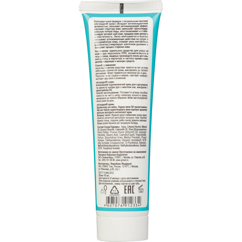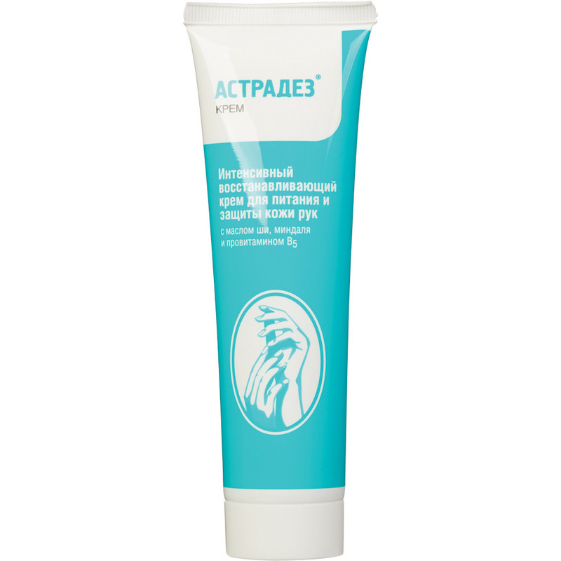 Интенсивный восстанавливающий крем 'Астрадез' объемом 100 мл для питания и защиты кожи рук с маслом ши, миндаля и провитамином В5 специально для работников медучреждений и пищевых производств, где требуется ежедневная многократная обработка кожи рук антисептиками. Прекрасное средство для ухода за кожей рук медицинского персонала после длительной работы в перчатках и частого применения дезинфицирующих и моющих средств, персонала пищевых производств, косметических и тату- салонов. Рекомендуется применять для обработки кожи больных перед нанесением гипса и тугих повязок. Способ применения: после мытья мягким средством нанести на кожу небольшое количество крема, массировать до полного впитывания. Может применяться в течение всего дня. Кожа станет гладкая и нежная, выглядеть здоровой и ухоженной.