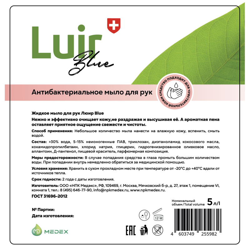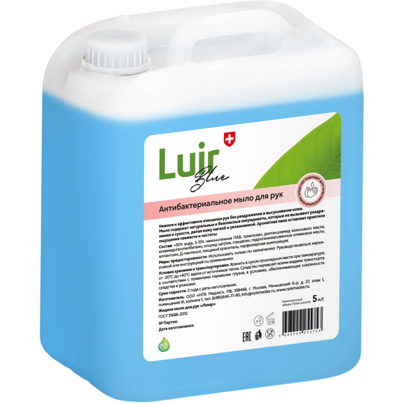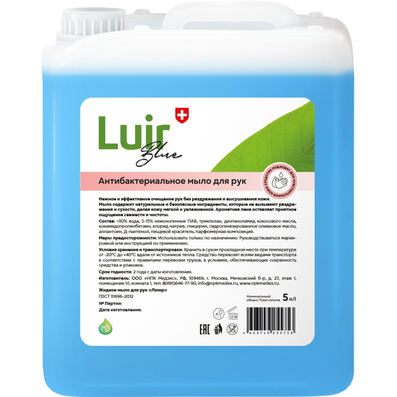 Дезинфицирующее мыло ?Люир? антибактериальное 5 л. Предназначено для гигиенической обработки рук медицинского персонала (в том числе оперирующего персонала в лечебно-профилактических учреждениях (далее ЛПУ) перед использованием кожного антисептика) и санитарной обработки кожных покровов пациентов в ЛПУ, детских дошкольных и школьных учреждений, санаториев, домов отдыха, пансионатов, учреждений соцобеспечения, предприятий коммунально-бытового обслуживания, предприятий пищевой промышленности, общественного питания, транспорта, а также населения в быту. Обладает бактерицидной (золотистый стафилококк, кишечная палочка) и фунгицидной (грибы рода Кандида, Aspergillins niger) активностью, исследовано в соответствии с требованиями санитарно-эпидемиологического законодательства. Состав: в качестве действующего вещества триклозан, а также функциональные добавки, увлажняющие и ухаживающие за кожей компоненты. Меры предосторожности: использовать только для наружного применения. Избегать попадания в глаза. Не использовать по истечении срока годности. При случайном попадании в глаза их следует обильно промыть чистой проточной водой. При случайном попадании в желудок рекомендуется промыть его водой комнатной температуры. Затем выпить несколько стаканов воды с добавлением абсорбента (10-15 таблеток активированного угля). Условия хранения: хранить средство в сухих складских помещениях отдельно от пищевых продуктов и лекарственных средств, в местах недоступных детям, при температуре 0 °С до + 35 °С. Срок годности: 24 месяца. Страна происхождения: Россия.