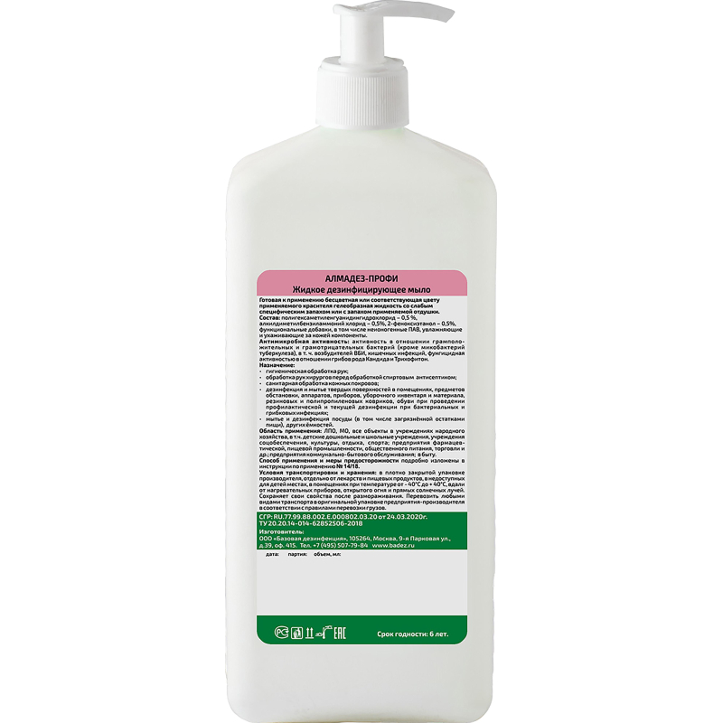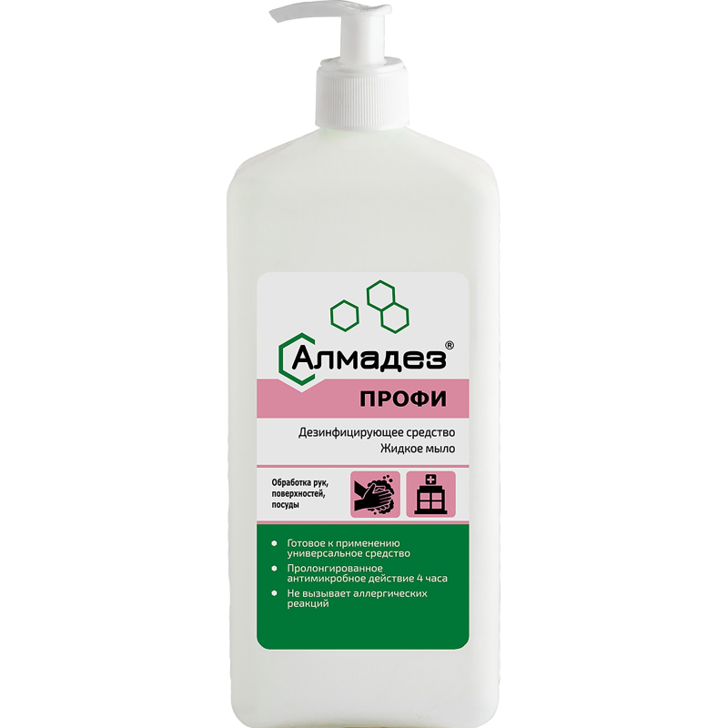 Дезинфицирующее средство (жидкое мыло) 'Алмадез-профи' представляет собой готовую к применению бесцветную или соответствующую цвету применяемого красителя гелеобразную жидкость со слабым специфическим запахом или с запахом применяемой отдушки. Свойства: обеспечивает длительную защиту от бактерий. Пролонгированный антимикробный эффект не менее 4 часов. Не сушит и не раздражает кожу рук даже при очень частом использовании, сохраняет эластичность, не вызывает аллергических реакций. Подходит для частой повседневной обработки, т. к. содержит специальные добавки, смягчающие, увлажняющие и восстанавливающие кожу рук, мытье и дезинфекция различных поверхностей и посуды, обладает выраженными моющими и дезодорирующими свойствами. Моющая способность средства более 95%. Удаляет жировые и пигментирующие загрязнения (в том числе застарелые) на обрабатываемых поверхностях, умывание рабочего раствора средства с обработанных поверхностей (кроме поверхностей, контактирующих с посудой, продуктами питания) после дезинфекции не требуется, средство сохраняет свои свойства после замораживания и последующего оттаивания. Токсичность и безопасность: по параметрам острой токсичности при введении в желудок и нанесении на кожу согласно ГОСТ 12.1.007-76 относится к 4 классу мало опасных соединений. При ингаляционном воздействии паров в насыщающих концентрациях относится к 4 классу мало опасных дезинфицирующих средств по степени летучести.