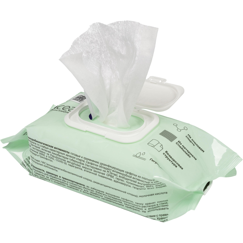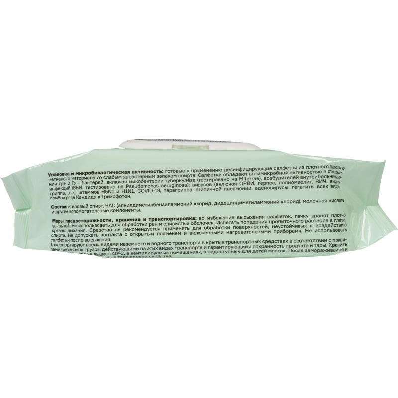 Дезинфицирующие салфетки в индивидуальной упаковке из плотного нетканого материала, пропитанные смесью на основе этилового спирта. Обладают пролонгированным эффектом не менее 3-х часов. Применяются для дезинфекции рабочих поверхностей, гигиенической обработки рук, перчаток из различных материалов. Готовы к использованию для экспресс-дезинфекции. Состав пропитки: этиловый спирт 65%, ЧАС (дидецилдиметиламмоний хлорид и алкилдиметилбензиламмония хлорид) суммарно 0,2%, молочная кислота, вспомогательные компоненты. Объекты обработки: дезинфекция рук и поверхностей, гигиеническая обработка локтевых сгибов доноров и пациентов, обеззараживание инъекционного поля, дезинфекция санитарно-технического оборудования, предметов простой конфигурации. Сфера применения: в медицинских учреждениях, в сферах торговли, в школах, в парикмахерских, косметологических услугах, в транспорте, в бассейнах и фитнес-центрах, кафе и ресторанах, в офисе, в быту, в клининге и бьюти индустрии. Бактерицидная активность: бактерии (Гр+ бактерии, в т.ч. микобактерии туберкулеза (М.Terrae), внутрибольничные инфекции. Гр- бактерии), вирусы (Аденовирусы, гриппа H5N1, гриппа H1N1, атипичной пневмонии, парагриппа, ОРВИ, вирусы гепатитов А, В, С, герпеса, ВИЧ, полиомиелита), грибы (Кандида, Трихофитон).