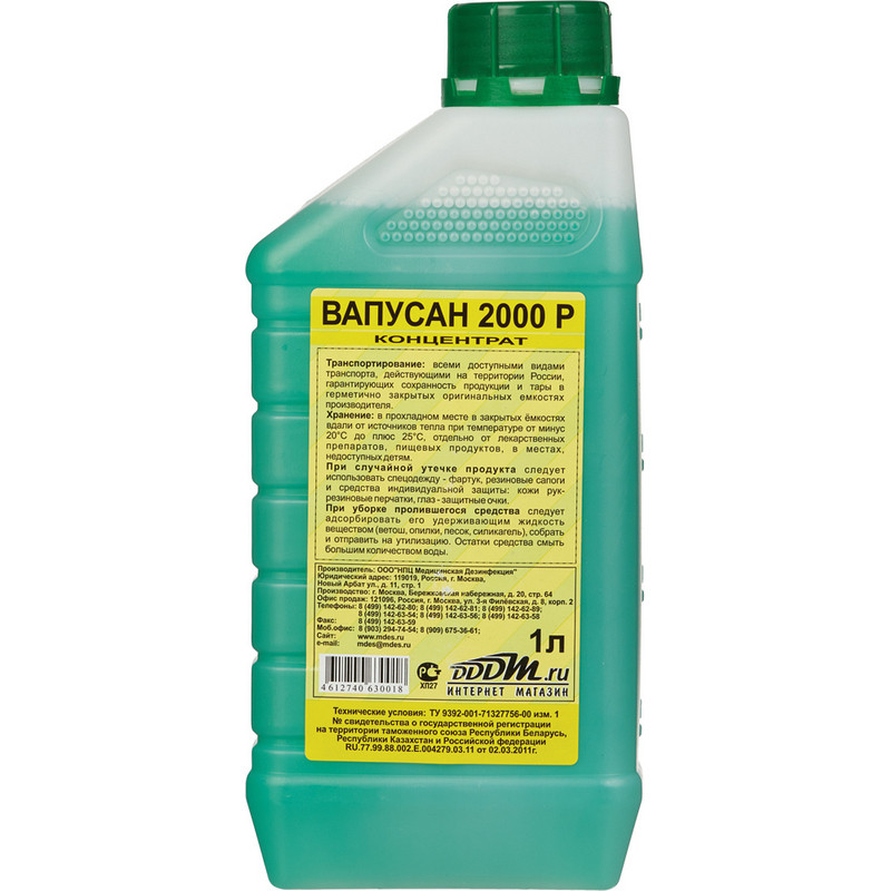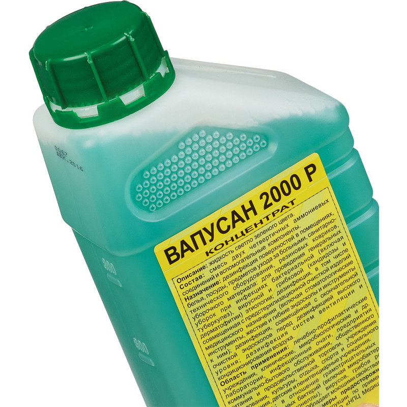Дезинфицирующее средство 'Вапусан 2000' 1 л (концентрат). Химический состав дезсредства: ЧАС, вспомогательные компоненты. Действующие вещества: алкилдиметилбензиламмоний хлорид (АДБАХ) 4.9 %, алкилдиметилэтилбензиламмоний хлорид 4.9 %, вспомогательные компоненты. Сфера применения: акушерские стационары, ЛПУ, клинические лаборатории, станции переливания крови, детские учреждения (детсады, школы и т.п.), предприятия общественного питания, предприятия продовольственной торговли, коммунальные объекты (бани, бассейны, гостиницы, общественные туалеты и т.п.). Объекты обработки: белье нательное, белье постельное, гибкие эндоскопы, жесткая мебель, жесткие эндоскопы, ИМН из металлов, резин на основе натурального и силиконового каучука, стекла, пластмасс, ИМН обычные, инструменты к эндоскопам, инструменты стоматологические, поверхности в помещениях, предметы ухода за больными, резиновые и полипропиленовые коврики, санитарно-техническое оборудование, столовая посуда, уборочный инвентарь. Основные режимы применения средства (концентрация/время): дезинфекция поверхностей по бактериям, исключая туберкулез (0.5 %/60 мин., 1 %/30 мин.), дезинфекция поверхностей по вирусным инфекциям (2 %/60 мин., 3 %/30 мин.), дезинфекция поверхностей по кандидозу (2 %/60 мин., 3 %/30 мин.), дезинфекция поверхностей по дерматофитам (2 %/120 мин.), дезинфекция поверхностей по туберкулезу (3 %/90 мин.), дезинфекция ИМН при бактериальных, вирусных инфекциях и кандидозе (2 %/90 мин., 3 %/60 мин.), дезинфекция, совмещенная с ПСО ИМН при бактериальных, вирусных инфекциях и кандидозе (2 %/90 мин.). Класс опасности: при введении в желудок - 4; при нанесении на кожу - 4; рабочего раствора - 4. Активно в отношении: бактерии (Mycobacterium tuberculosi, грамотрицательные бактерии, грамположительные бактерии), вирусы (грипп, парагрипп, прочие возбудители ОРВИ), патогенные грибы (дерматофитон, кандида). Срок годности: в упаковке - 5 лет, в рабочем растворе - 14 дней. Страна производства: Россия.