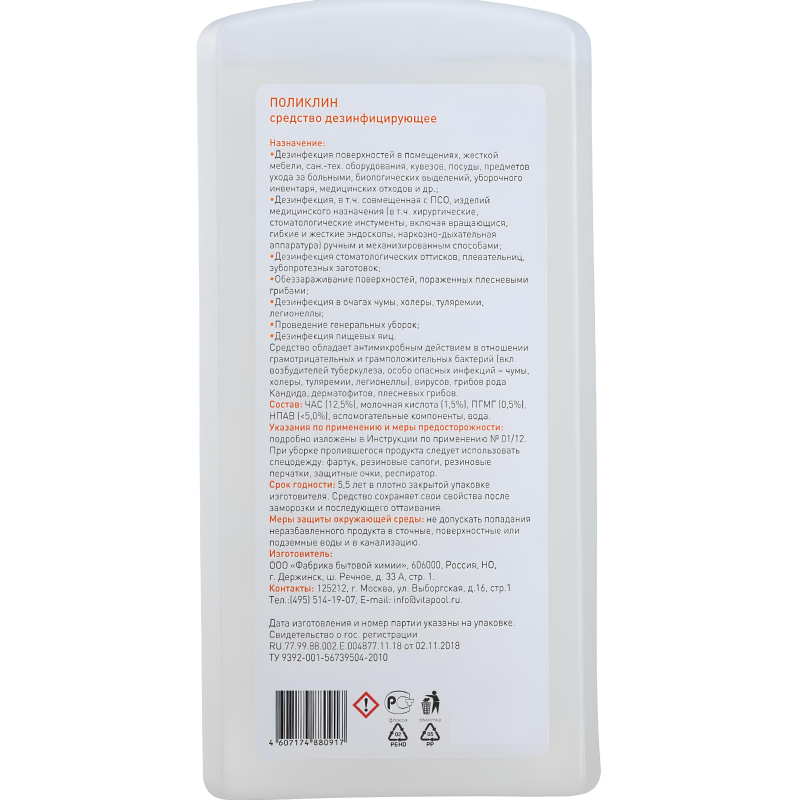Дезинфицирующее средство 'Поликлин' 1 л (концентрат). Химический состав дезсредства: ЧАС, гуанидин, кислоты, ПАВ. Действующие вещества: алкилдиметилбензиламмоний хлорид (АДБАХ) 12 %, дидецилдиметиламмоний хлорид 0.5 %, молочная кислота 1.5 %, полигексаметиленгуанидин гидрохлорид (ПГМГ) 0.5 %, ПАВы. Сфера применения: акушерские стационары, ЛПУ, клинические лаборатории, станции переливания крови, бактериологические лаборатории, детские учреждения (детсады, школы и т.п.), пенитенциарные учреждения, инфекционные очаги, предприятия общественного питания, предприятия продовольственной торговли, потребительские рынки, коммунальные объекты (бани, бассейны, гостиницы, общественные туалеты и т.п.), учреждения соцобеспечения, парикмахерские, Косметические и (или) массажные салоны, санитарный транспорт, отделения неонатологии, предприятия фармацевтической промышленности, аптеки, отделения физиотерапевтического профиля, учреждения культуры, отдыха (кинотеатры, музеи, театры), спортивные и культурно-оздоровительные комплексы, объекты курортологии, диагностические лаборатории, вирусологические лаборатории, морги и ритуальные учреждения. Объекты обработки: анестезиологическое оборудование, аптечная посуда, баки накопительные автономных туалетов, белье нательное, белье постельное, бытовые кондиционеры, вентиляционные фильтры, воздух в помещениях, воздуховоды, вращающиеся стоматологические инструменты, выделения больного (моча, фекалии, мокрота), гибкие эндоскопы, датчики диагностического оборудования (УЗИ и т.д.), донорская кровь и препараты крови с истекшим сроком годности, жесткая мебель, жесткие эндоскопы, жидкость после ополаскивания зева, заполнение дезбарьеров, дезматов, дезковриков, зеркала с амальгамой, игрушки, ИМН из металлов, резин на основе натурального и силиконового каучука, стекла, пластмасс, ИМН обычные, ИМН одноразовые перед утилизацией, Инструменты к эндоскопам, Инструменты парикмахерских, массажных, косметических салонов, инструменты стоматологические, инструменты хирургические, кровь, крышные кондиционеры, кувезы, лабораторная посуда, медицинские отходы из текстильных материалов (ватные и марлевые тампоны, марля, бинты), мокрота, моча, мусороуборочное оборудование, мусоропроводы, мягкая мебель, напольные покрытия, наркозно-дыхательная аппаратура, ножи, разделочные доски, разделочные столы, тара, обивочные ткани, обувь из кожи, тканей, кожезаменителей, одноразовая посуда, пищевые отходы, пиявки медицинские, плевательницы, поверхности в помещениях, поверхности приборов и аппаратов, посуда из-под выделений, почва, предметы для мытья посуды, предметы личной гигиены, предметы обстановки, предметы ухода за больными, приспособления к кювезам, рвотные массы, резиновые и полипропиленовые коврики, санитарно-техническое оборудование, санитарный транспорт, системы вентиляции и кондиционирования воздуха, скорлупа пищевых яиц, слюноотсосы, смывные воды, спецодежда, сплит-системы, мультизональные сплит-системы, спортивный инвентарь, столовая посуда, стоматологические материалы (оттиски из альгината, силикона, полиэфирной смолы, зубопротезные заготовки, артикуляторы), стоматологические отсасывающие системы, транспорт для перевозки пищевых продуктов, уборочный инвентарь, фекалии, фекально-мочевая взвесь, эндоскопическ