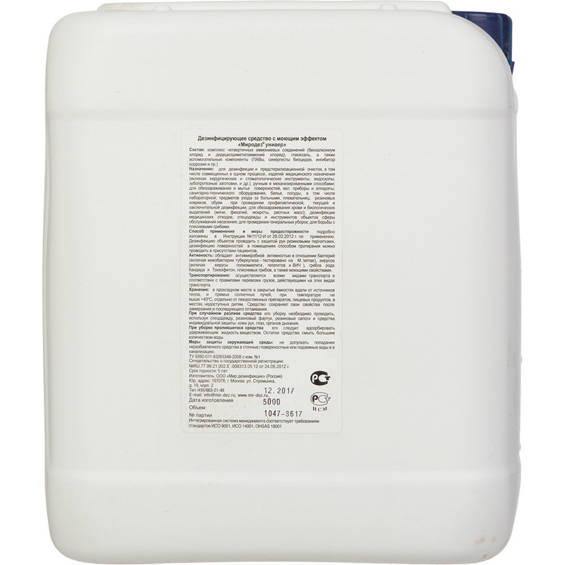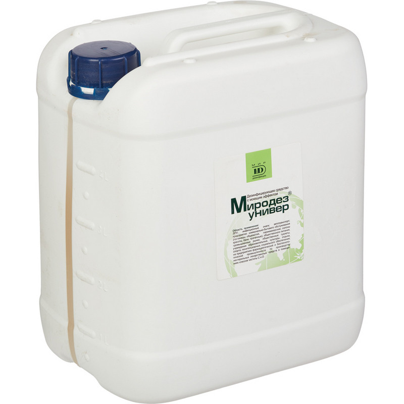 Дезинфицирующее средство 'Миродез Универ' 5 л (концентрат). Химический состав дезсредства: ЧАС, альдегид, вспомогательные компоненты. Действующие вещества: алкилдиметилбензиламмоний хлорид (АДБАХ) + дидецилдиметиламмоний хлорид 12 %, глиоксаль 5.7 %, вспомогательные компоненты. Сфера применения: ЛПУ, клинические лаборатории, станции переливания крови, бактериологические лаборатории, инфекционные очаги, предприятия общественного питания, предприятия продовольственной торговли, потребительские рынки, коммунальные объекты (бани, бассейны, гостиницы, общественные туалеты и т.п.), учреждения соцобеспечения, парикмахерские, косметические и (или) массажные салоны, прачечные, санитарный транспорт, отделения неонатологии, предприятия фармацевтической промышленности, учреждения культуры, отдыха (кинотеатры, музеи, театры), спортивные и культурно-оздоровительные комплексы, диагностические лаборатории. Объекты обработки: белье нательное, белье постельное, вращающиеся стоматологические инструменты, выделения больного (моча, фекалии, мокрота), гибкие эндоскопы, жесткая мебель, жесткие эндоскопы, игрушки, ИМН из металлов, резин на основе натурального и силиконового каучука, стекла, пластмасс, ИМН обычные, ИМН одноразовые перед утилизацией, инструменты к эндоскопам, инструменты стоматологические, инструменты хирургические, кровь, лабораторная посуда, медицинские отходы из текстильных материалов (ватные и марлевые тампоны, марля, бинты), мокрота, моча, мусороуборочное оборудование, мусоропроводы, обувь из пластика, резины, одноразовая посуда, пищевые отходы, поверхности в помещениях, поверхности приборов и аппаратов, предметы для мытья посуды, предметы личной гигиены, предметы ухода за больными, рвотные массы, резиновые и полипропиленовые коврики, санитарно-техническое оборудование, санитарный транспорт, слюноотсосы, столовая посуда, стоматологические материалы (оттиски из альгината, силикона, полиэфирной смолы, зубопротезные заготовки, артикуляторы), транспорт для перевозки пищевых продуктов, уборочный инвентарь, фекалии. Основные режимы применения средства (концентрация/время): дезинфекция поверхностей по бактериям, исключая туберкулез (0.01 %/120 мин., 0.05 %/60 мин., 0.1 %/30 мин., 0.2 %/15 мин., 0.5 %/5 мин.), дезинфекция поверхностей по вирусным инфекциям (0.1 %/60 мин., 0.25 %/30 мин., 0.5 %/15 мин.), дезинфекция поверхностей по кандидозу (0.1 %/60 мин., 0.25 %/30 мин., 0.5 %/15 мин.), дезинфекция поверхностей по дерматофитам (0.1 %/60 мин., 0.25 %/30 мин., 0.5 %/15 мин.), дезинфекция поверхностей по туберкулезу (0.5 %/60 мин., 1 %/30 мин.), дезинфекция ИМН при бактериальных, вирусных инфекциях и кандидозе (0.2 %/60 мин., 0.4 %/30 мин.), дезинфекция, совмещенная с ПСО ИМН при бактериальных, вирусных инфекциях и кандидозе (0.2 %/60 мин., 0.4 %/30 мин.), дезинфекция крови (0.5 %/90 мин., 1 %/60 мин., 2 %/30 мин.), дезинфекция мокроты (0.5 %/90 мин., 1 %/60 мин., 2 %/30 мин.), дезинфекция фекалий (0.5 %/90 мин., 1 %/60 мин., 2 %/30 мин.). Класс опасности: при введении в желудок - 3; при нанесении на кожу - 4; рабочего раствора - 4. Активно в отношении: бактерии (Mycobacterium tuberculosi, грамотрицательные бактерии, грамположительные бактерии), вирусы (аденовирусы, атипичной пневмонии, ВИЧ, герпеса, грипп, парагрипп, парентеральных гепатитов, полиомиелит, прочие возбудители ОРВИ, птичьего гриппа (H5N1), ротавирусы, энтеральных гепатитов, энтеровирусы), патогенные грибы (дерматофит