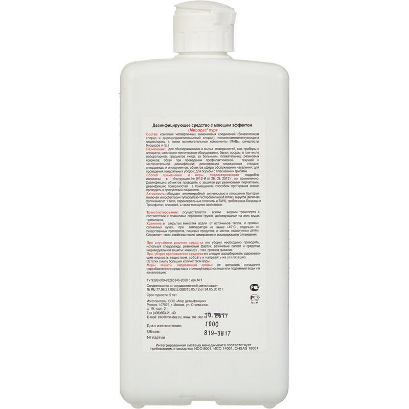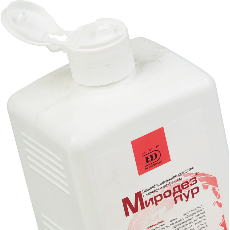 Дезинфицирующее средство ?Миродез Пур? 1 л (концентрат). Химический состав дезсредства: ЧАС, гуанидин, поверхностно-активные вещества (ПАВ), вспомогательные компоненты. Действующие вещества: алкилдиметилбензиламмоний хлорид (АДБАХ) + дидецилдиметиламмоний хлорид 2 %, полигексаметиленгуанидин гидрохлорид (ПГМГ) 2.5 %, вспомогательные компоненты, ПАВы. Сфера применения: акушерские стационары, лпу, клинические лаборатории, бактериологические лаборатории, детские учреждения (детсады, школы и т.п.), пенитенциарные учреждения, инфекционные очаги, предприятия общественного питания, потребительские рынки, коммунальные объекты (бани, бассейны, гостиницы, общественные туалеты и т.п.), учреждения соцобеспечения, парикмахерские, косметические и (или) массажные салоны, прачечные, санитарный транспорт, отделения неонатологии, предприятия фармацевтической промышленности, учреждения культуры, отдыха (кинотеатры, музеи, театры), спортивные и культурно-оздоровительные комплексы, объекты курортологии, диагностические лаборатории, морги и ритуальные учреждения. Объекты обработки: белье нательное, белье постельное, жесткая мебель, игрушки, ИМН одноразовые перед утилизацией, лабораторная посуда, мед. отходы из текстильных материалов (ватные и марлевые тампоны, марля, бинты), мусоросборочное оборудование, мусоропроводы, обувь из пластика, резины, одноразовая посуда, поверхности в помещениях, поверхности приборов и аппаратов, предметы для мытья посуды, предметы личной гигиены, предметы ухода за больными, резиновые и полипропиленовые коврики, санитарно-техническое оборудование, санитарный транспорт, столовая посуда, транспорт для перевозки пищевых продуктов, уборочный инвентарь. Основные режимы применения средства (концентрация/время): Дезинфекция поверхностей по бактериям (исключая туберкулез) (0.1 %/60 мин., 0.2 %/30 мин., 0.4 %/15 мин., 1 %/5 мин.), Дезинфекция поверхностей по вирусным инфекциям (0.5 %/30 мин., 1 %/15 мин.), Дезинфекция поверхностей по кандидозу (0.3 %/60 мин., 0.5 %/30 мин., 1 %/120 мин.), Дезинфекция поверхностей по дерматофитам (0.5 %/120 мин., 0.8 %/90 мин., 1 %/60 мин.), Дезинфекция поверхностей по туберкулезу (0.8 %/60 мин., 1.2 %/30 мин., 1.5 %/15 мин.). Класс опасности: при введении в желудок - 4; при нанесении на кожу - 4; рабочего раствора - 4. Активно в отношении: - бактерии (Mycobacterium tuberculosi, грамотрицательные бактерии, грамположительные бактерии); - вирусы (аденовирусы, атипичной пневмонии, вич, герпеса, грипп, парагрипп, парентеральных гепатитов, полиомиелит, прочие возбудители орви, птичьего гриппа (h5n1), ротавирусы, энтеральных гепатитов, энтеровирусы); - патогенные грибы (дерматофитон, кандида, плесневые грибы). Особые свойства: сохранение свойств при замораживании/размораживании, не обесцвечивает ткани, не фиксирует органические загрязнения, не агрессивно по отношению к объектам обработки. Срок годности: в упаковке - 5 лет, в рабочем растворе - 14 дней. Страна производства: Россия.