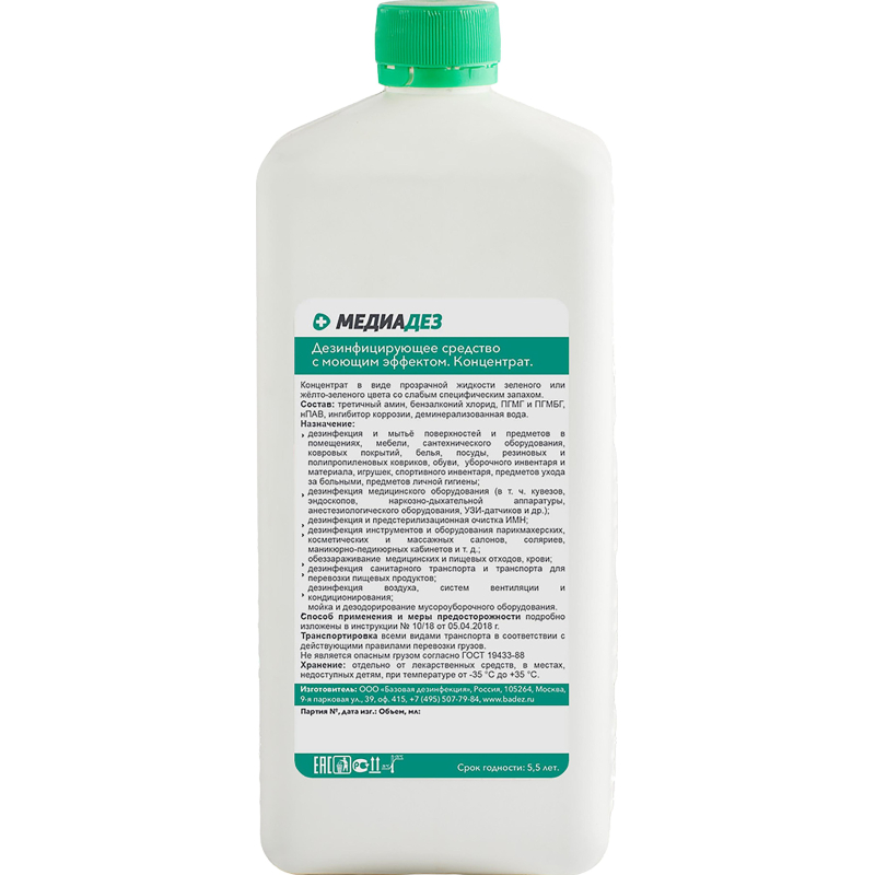Дезинфицирующее средство Медиадез 1 л (концентрат). Представляет собой прозрачную жидкость без механических примесей от желто-зеленого до зеленого цвета со слабым специфическим запахом или запахом применяемой отдушки. Состав: N,N-бис-(3-аминопропил) додециламина - 2,5 %, алкилдиметилбензиламмоний хлорида - 7 %, полигексаметиленгуанидин гидрохлорида и полигексаметиленбигуанидин гидрохлорида - 2,4 % (суммарно), моющий компонент, ингибитор коррозии, отдушка, вода. Антимикробная активность в отношении: - грамотрицательных и грамположительных бактерий (включая микобактерии туберкулеза Mycobacterium terrae); - возбудителей внутрибольничных инфекций (ВБИ); - кишечных инфекций - бактерий группы кишечной палочки, стафилококков, стрептококков, сальмонелл; - вирусов (включая аденовирусы, вирусы гриппа, парагриппа и др. возбудителей острых респираторных инфекций, энтеровирусы, ротавирусы, вирус полиомиелита, вирусы энтеральных, парентеральных гепатитов, герпеса, атипичной пневмонии, птичьего гриппа, свиного гриппа, ВИЧ и др.); - грибов рода Кандида, Трихофитон (дерматофитий); - плесневых грибов Aspergillus niger; - возбудителей анаэробных инфекций; - возбудителей легионеллеза; - особо опасных инфекций (чумы, холеры, туляремии). Срок хранения концентрата - 5,5 лет, срок хранения рабочего раствора - 35 суток.