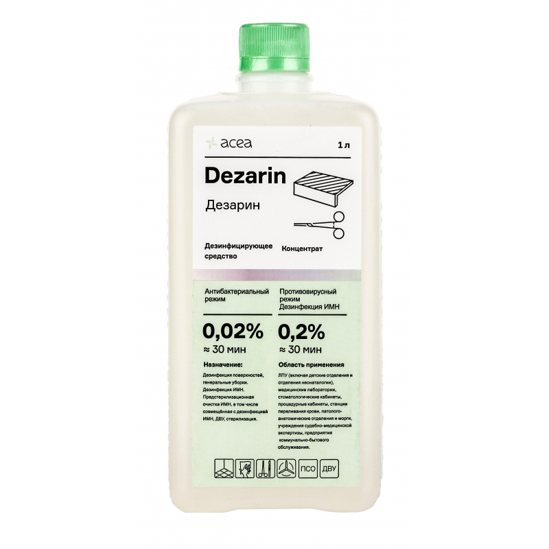 Дезинфицирующее средство Дезарин 1 л. Химический состав: ЧАС, вспомогательные компоненты. Действующие вещества: третичные амины (додециламин) 2,5%, ЧАС 5,3%, ПГМГ (производные гуанидина) 1%, ингибиторы коррозии, функциональные добавки. Сфера применения: роддома, палаты новорожденных, отделения неонаталогии, кювезы, эндоскопические отделения, анестезиологическое оборудование и детали наркозно-дыхательной аппаратуры, клинические, микробиологические и другие лаборатории, стоматологические инструменты, оттиски, заготовки, слюноотсосы, плевательницы, пищеблоки ЛПУ. Объекты обработки: дезинфекция поверхностей, предметов ухода, белья и прочее, дезинфекция медицинских и пищевых отходов, дезинфекция скорлупы пищевых яиц, дезинфекция изделий медицинского назначения, дезинфекция изделий медицинского назначения совмещенная с предстерилизационной обработкой, в том числе в УЗО, предстерилизационная обработка изделий медицинского назначения, в том числе в УЗО, окончательная очистка эндоскопов перед дезинфекцией высокого уровня, дезинфекция высокого уровня эндоскопов, стерилизация изделий медицинского назначения, дезинфекция крови (в сгустках) и биологических выделений, вакцин (в том числе просроченных), культур бактерий и вирусов. Активно в отношении: бактерии (Mycobacterium tuberculosi, грамотрицательные бактерии, грамположительные бактерии, вирусы (аденовирусы,гриппа H5N1, гриппа H1N1, парагриппа, ОРВИ, SARS, энтеровирусы, ротавирусы, вирусы гепатитов А, Е, В, С, D, G, герпеса, ВИЧ, полиомиелита), патогенные грибы (кандида, трихофитон, плесневые грибы), особо опасные инфекции (чума, холера, туляремия, сибирская язва), паразиты (цисты и ооцисты простейших, яйца и личинки гельминтов). Срок годности: в упаковке - 5 лет, срок годности рабочего раствора 46 суток. Страна производства: Россия.
