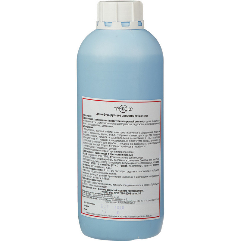 Дезинфицирующее средство 'Трилокс' 1 л (концентрат). Химический состав дезсредства: ЧАС, третичный амин, гуанидин. Действующие вещества: N,N-бис(3-аминопропил)додециламин 3.8 %, алкилдиметилбензиламмоний хлорид (АДБАХ) 3.8 %, полигексаметиленгуанидин гидрохлорид (ПГМГ) 7.5 %. Сфера применения: акушерские стационары, ЛПУ, клинические лаборатории, бактериологические лаборатории, детские учреждения (детсады, школы и т.п.), инфекционные очаги, санитарный транспорт, отделения неонатологии. Объекты обработки: белье нательное, белье постельное, вращающиеся стоматологические инструменты, гибкие эндоскопы, жесткая мебель, жесткие эндоскопы, игрушки, ИМН из металлов, резин на основе натурального и силиконового каучука, стекла, пластмасс, ИМН обычные, ИМН одноразовые перед утилизацией, инструменты к эндоскопам, инструменты стоматологические, инструменты хирургические, кувезы, лабораторная посуда, мед. отходы из текстильных материалов (ватные и марлевые тампоны, марля, бинты), обувь из пластика, резины, одноразовая посуда, поверхности в помещениях, поверхности приборов и аппаратов, предметы для мытья посуды, предметы ухода за больными, резиновые и полипропиленовые коврики, санитарно-техническое оборудование, уборочный инвентарь. Класс опасности: при введении в желудок - 3; при нанесении на кожу - 4; рабочего раствора - 4. Активно в отношении: - бактерии (Mycobacterium tuberculosi, грамотрицательные бактерии, грамположительные бактерии); - вирусы (аденовирусы, атипичной пневмонии, ВИЧ, герпеса, грипп, парагрипп, парентеральных гепатитов, полиомиелит, прочие возбудители ОРВИ, птичьего гриппа (H5N1), ротавирусы, энтеральных гепатитов, энтеровирусы); - возбудители особо опасных инфекций (туляремия, холера, чума); - патогенные грибы (дерматофитон, кандида). Срок годности: в упаковке - 3 года, в рабочем растворе - 14 дней. Страна производства: Россия.