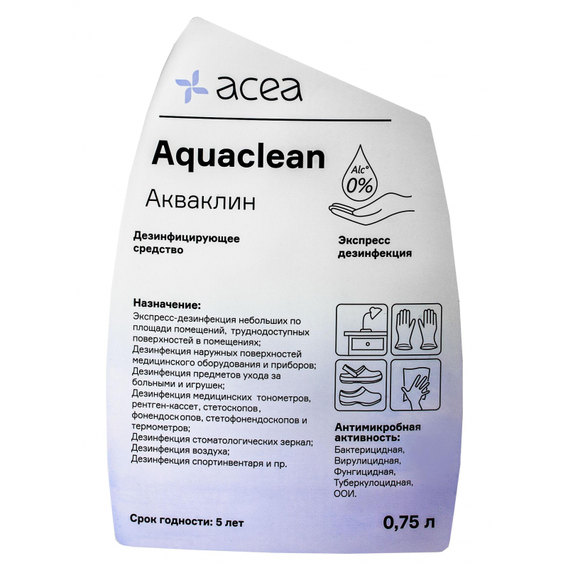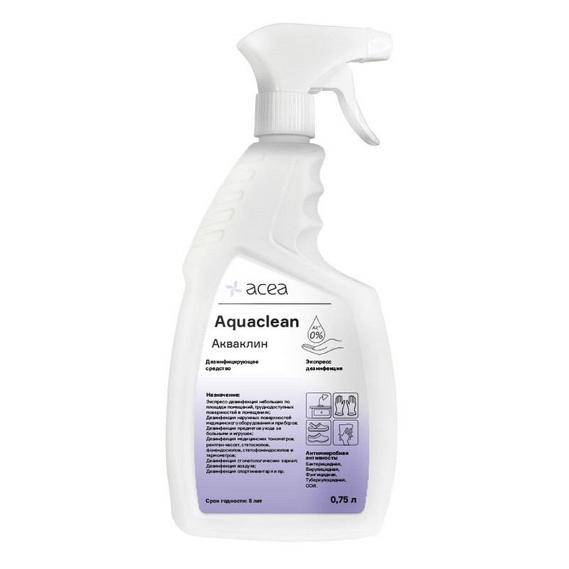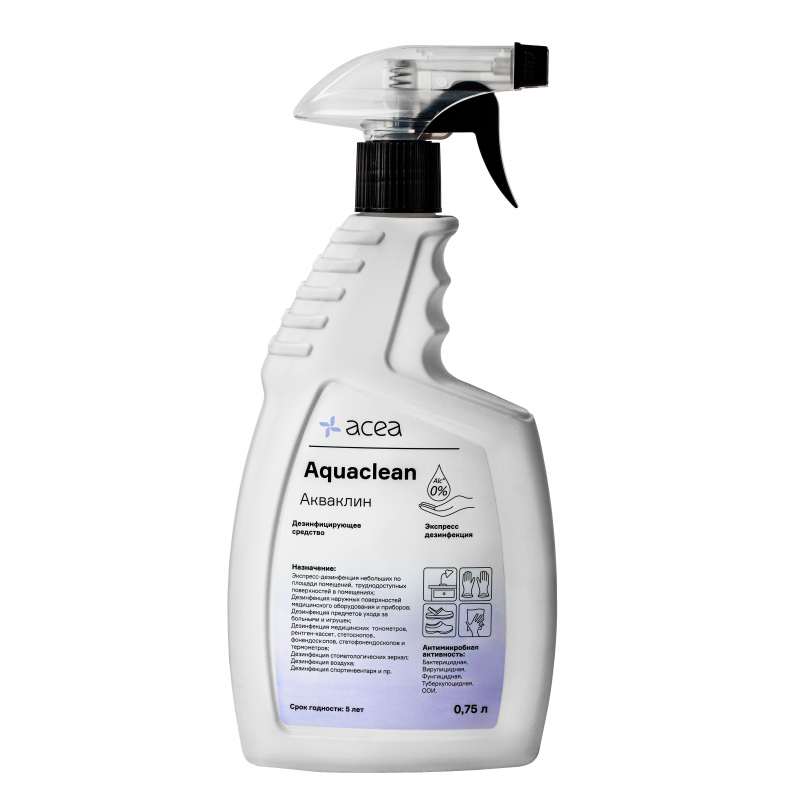 Дезинфицирующий спрей Акваклин 750 мл. Химический состав: хлориды, вспомогательные компоненты. Действующие вещества: полигексаметиленгуанидин гидрохлорид 0,25%, алкилдиметилбензиламмоний хлорид 0,3%, 2-феноксиэтанол 2%, увлажняющие и ухаживающие за кожей добавки. Сфера применения: ЛПУ, в том числе акушерско-гинекологического профиля, отделения неонтологии, интенсивной терапии, кожно-венерологические отделения, лаборатории, станции скорой медицинской помощи, предприятия пищевой, фармацевтической и биотехнологической промышленности, учреждения социального обеспечения, санпропускники, детские и общеобразовательные учреждения. Объекты обработки: гигиеническая обработка рук медицинского персонала, дезинфекционная обработка и обеззараживание перчаток, надетых на руки медицинского персонала, экспресс-дезинфекция небольших по площади поверхностей и объектов, дезинфекция воздуха, дезинфекция наружных поверхностей медицинского оборудования и приборов, дезинфекция датчиков УЗИ и фонендоскопов. Активно в отношении: бактерии (Mycobacterium tuberculosi, грамотрицательные бактерии, грамположительные бактерии, вирусы (герпес, острые респираторные вирусные инфекции, полиомиелита, гепатиты А, В и С, ВИЧ, гриппа типа А, в т.ч. А H5NI, А HINI, атипичной пневмонии, парагриппа, аденовирусов), патогенные грибы (кандида), особо опасные инфекции (холера, туляремия, бруцеллез). Срок годности: в упаковке - 5 лет. Страна производства: Россия.