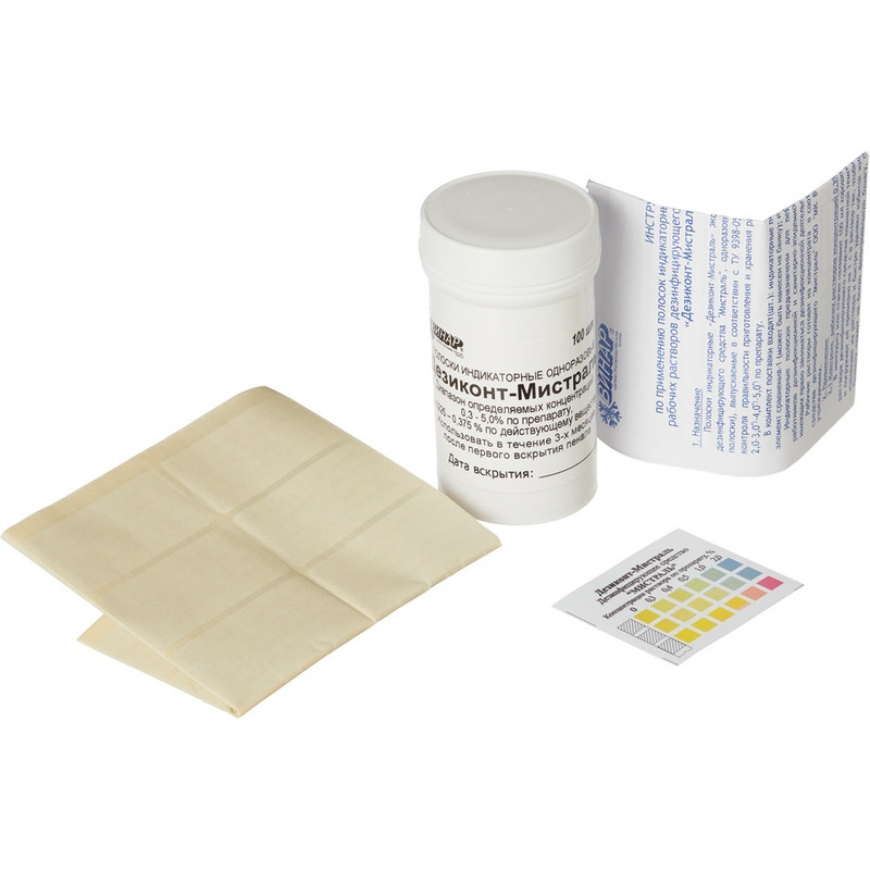 Полоски индикаторные могут быть предназначены для экспресс-контроля концентраций рабочих растворов дезинфицирующего средства ?Мистраль? в диапазоне концентраций от 0,3% до 2,0% по препарату. Время контроля не более 3 минут. Индикаторные полоски предназначены для персонала лечебно-профилактических учреждений, работников дезинфекционной и санитарно-эпидемиологической служб, а также других учреждений, имеющих право заниматься дезинфекционной деятельностью. Гарантийный срок не менее 18 месяцев. Поставляется в комплекте с журналом контроля концентраций рабочих растворов дезинфицирующих и стерилизующих средств. Комплект из 100 индикаторных полосок.