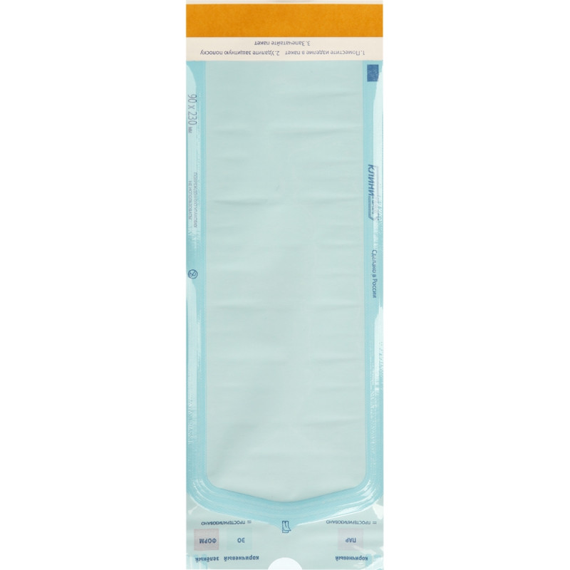 Пакет для стерилизации комбинированный Клинипак для паровой/газовой стерилизации 90 x 230 мм самоклеящийся (200 штук в упаковке). Пакеты для стерилизации самозаклеивающиеся ?Клинипак? для паровой и газовой стерилизации предназначены для упаковывания изделий медицинского назначения перед стерилизацией с целью сохранения стерильности этих изделий после стерилизации, во время последующей их транспортировки и хранения до использования по назначению. Упаковка соответствует международному стандарту EN 868 и отвечает требованиям, предъявляемым к медицинским стерилизационным упаковочным материалам. Изготовлены из прозрачной многослойной полимерной (в комбинации полиэстер/полипропилен) пленки бледно-зеленого оттенка и специальной водоотталкивающей медицинской бумаги белого цвета (непрозрачная сторона), соединенных термошвом. Уголки пакетов дополнительно запаяны для предотвращения скопления в них пыли. На бумажной стороне пакетов и рулонного материала нанесены обозначения: 1. Размер изделия: 90x230 мм. Количество в упаковке: 200 шт.