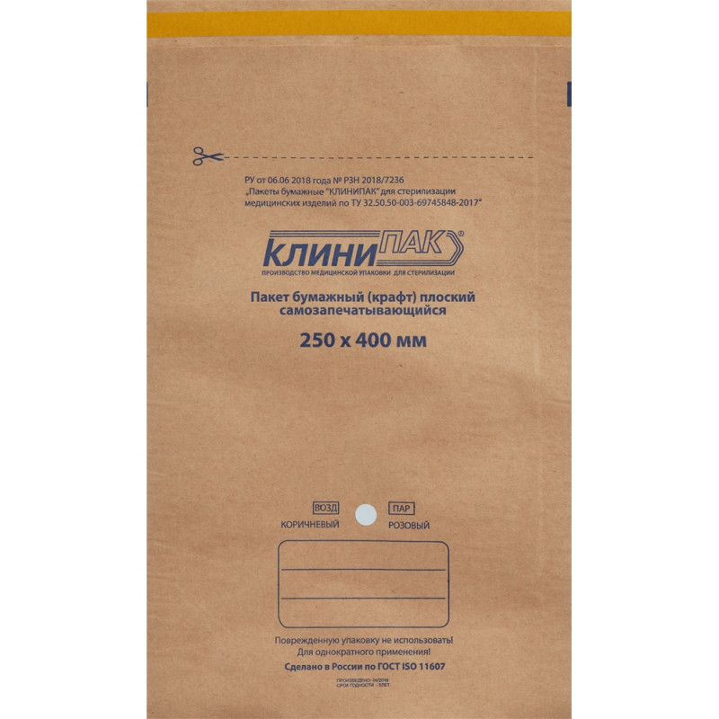 Крафт-пакет для стерилизации Клинипак для паровой/воздушной стерилизации 250 x 400 мм самоклеящийся (100 штук в упаковке). Пакеты ?Клинипак? изготовлены из специальной влагопрочной крафт-бумаги, плотностью 70 г/кв.м, имеют термоклеевые боковые швы. На выступающий клапан пакета нанесена полоска клеевого слоя, защищенная антиадгезивной бумажной полоской желтого цвета, предотвращающей высыхание клея. Пакеты ?Клинипак? предназначены для стерилизации воздушным методом (при температурах стерилизации 160-180°С) и паровым (при температурах стерилизации 121-134°С) методом в стерилизаторах, разрешенных к применению в Российской Федерации в установленном порядке. Пакеты предназначены для однократного применения. Срок хранения изделий медицинского назначения, простерилизованных в пакетах ?Клинипак?, составляет 50 дней. На лицевой стороне пакета нанесены следующие обозначения: торговая марка, размер пакета в мм, запрещение использовать упаковку в случае повреждений, информация об однократном применении пакета, индикатор воздушной и паровой стерилизации в виде стикера белого цвета. Индикатор является химическим индикатором 1 класса (ГОСТ Р ISO 11140-1-2000) и предназначен для 2-х видов стерилизации - паровой и воздушной. Исходный цвет индикатора - светло-серый. При стерилизации воздухом индикатор меняет свой цвет на светло-коричневый, при стерилизации паром - на темно-розовый. Пунктирной линией обозначается линия отреза при вскрытии пакета после стерилизации. Пакеты ?Клинипак? соответствуют требованиям технических условий производителя (ТУ 9398-019-52582566-2009) и требованиям ГОСТ Р ISO 11607-2003. Срок годности упаковок с момента их изготовления составляет 3 года при условии хранения упаковок при температуре от +10°С до +30°С и относительной влажности 30-50%. Размер изделия: 250x400 мм. Количество в упаковке: 100 шт.