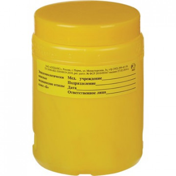 Упаковка для сбора медицинских отходов 'Олданс'. Предназначены для сбора острых медицинских отходов согласно СанПиН 2.1.7.2790-10. Емкости-контейнеры изготавливаются из композиции полимерных материалов с повышенными прочностными характеристиками, не прокалываемые, герметичные. Контейнеры цилиндрической формы. Контейнеры не разборные, готовые к применению. Допускается использование контейнеров в течение трех суток. Контейнеры комплектуются навинчиваемой (резьбовой) крышкой. Могут комплектоваться фиксатором против открывания крышки или специальной крышкой с запирающим элементом против открывания, ручкой для переноса, кольцом для крепления к контейнеру. Цвет и маркировка контейнеров соответствует классу опасности отходов. На емкости-контейнеры нанесен знак биологической опасности. Маркировочная этикетка по цвету соответствует классу опасности отходов, на ней указан класс опасности отходов. Есть место для маркировки отходов. Контейнер простой и удобный для работы, поставляется в собранном виде. Удобен для небольших процедурных, стоматологов, ФАПов, здравпунктов, укладок для врачей скорой помощи. Количество в упаковке: 50 штук. Потребитель лишается права на гарантийное обслуживание в следующих случаях: - по истечении срока годности; - при нарушении правил эксплуатации и хранения; - при наличии механических повреждений наружных частей по вине потребителя.