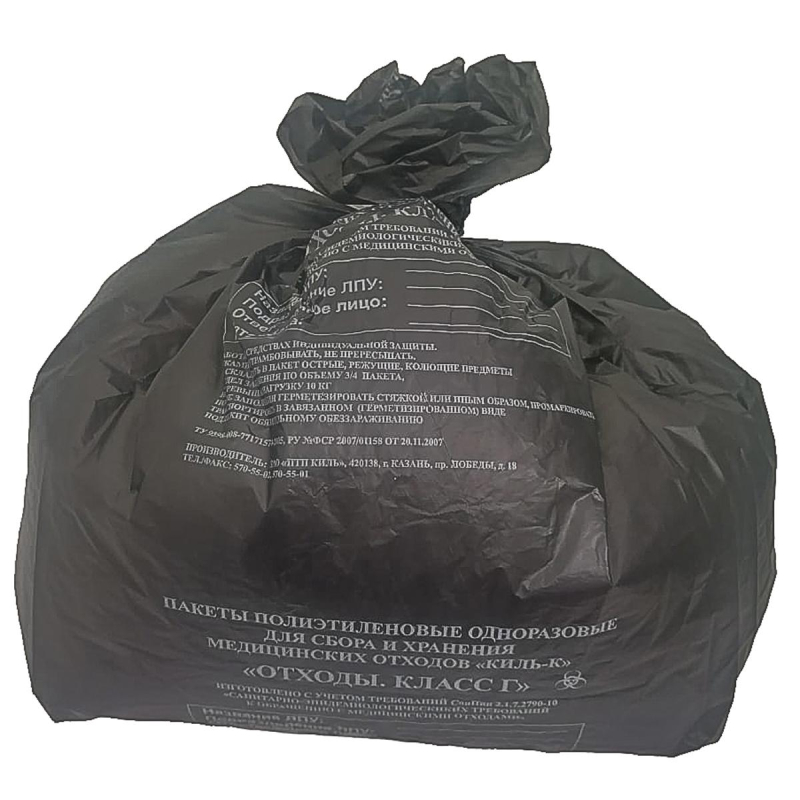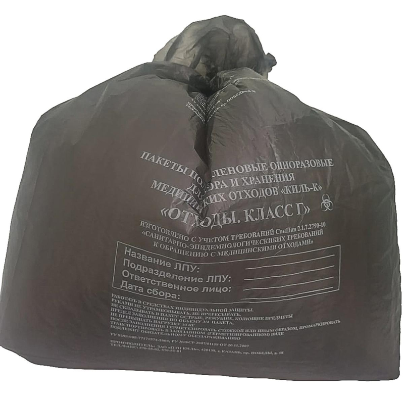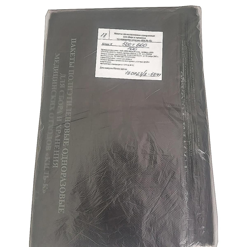 Пакет полиэтиленовый для сбора, хранения и утилизации медицинских отходов, одноразовый. Изделие насыщенного непрозрачного черного цвета (класс Г) изготовлено из полимерной пленки высшей категории качества, имеет толщину пленки не менее 18 микрон (не путем сложения), длину не менее 500 мм, ширину не менее 600 мм. При изготовлении должно быть предусмотрено добавление присадок, предотвращающих слипание стенок готового изделия, что необходимо для облегчения его подготовки к эксплуатации. На поверхности изделия должно быть наличие следующей маркировки: информационное окно с графами для заполнения (размером 23x23 см) с ярко выраженным четко читаемым (2 см) сведения о текущем классе опасности отходов; логотип и контактные данные производителя. Маркировка должна быть нанесена черной, нестирающейся при тактильном контакте краской строго посередине изделия. Наличие боковых складок не обязательно. Свойства: в случае прокола, пореза, изделие не должно расходиться, а должно сохранять свою целостность по всей поверхности. Общий объем изделия не более 30 литров. По дну изделия проходит сварной шов, шириной от 1,0 до 1,5 мм, он должен быть ровным, без пропусков, прожженных мест и складок.