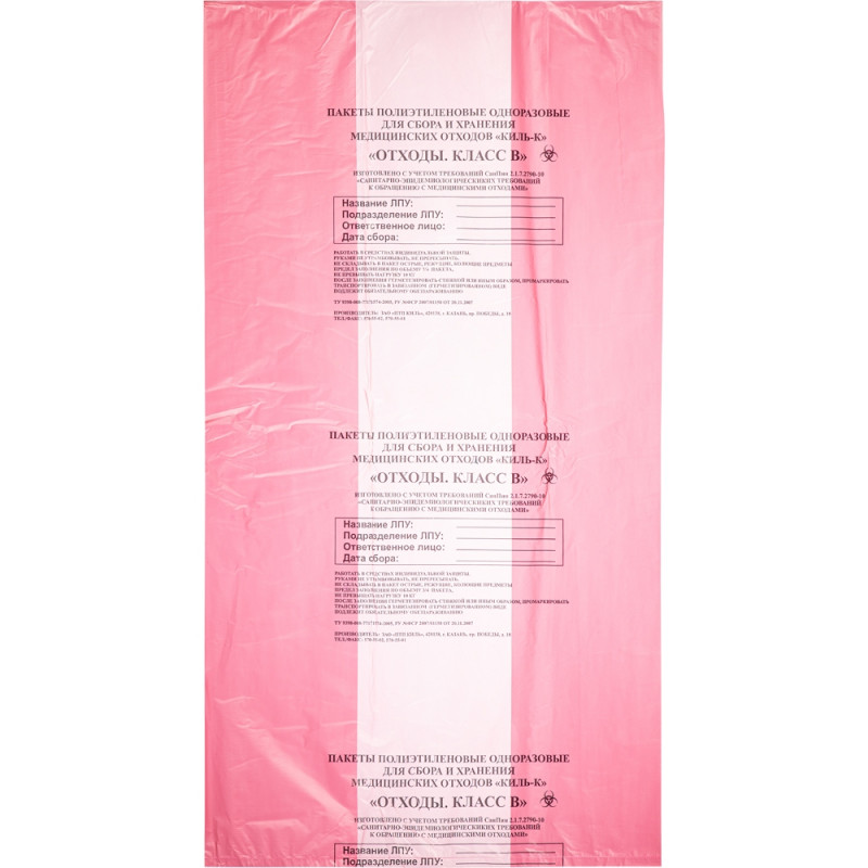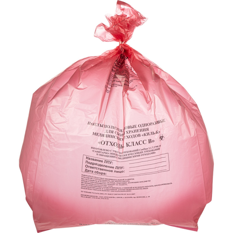 Пакеты для медицинских отходов ПТП Киль класс В. Объем: 120 литров. Цвет: красный. Размер: 70x110 см. Толщина стенки: 18 мкм. Пакеты по бокам имеют фальцы (внутреннее сложение) по 150 мм с каждой стороны, в развернутом виде пакет соответствует заявленному размеру. Пакеты полиэтиленовые одноразовые для сбора, хранения и утилизации медицинских отходов. Отходы класса В - это материалы, контактирующие с больными особо опасными инфекциями. Отходы из лабораторий, работающих с микроорганизмами 1-4 групп патогенности. Отходы фтизиатрических, микологических больниц. Отходы от пациентов с анаэробной инфекцией. Биологические отходы вивариев. Информационное окно напечатано по центру пакета и содержит следующую информацию: класс отходов, название ЛПУ, ФИО ответственного лица за сбор отходов, дата сбора отходов. На пакет наносится информация о производителе, № ТУ и № РУ производителя. Цвет пакета соответствует цветовой кодировке отходов класс В (цвет - красный). Материал: полиэтилен. Выдерживаемая нагрузка - до 10 кг. Количество в упаковке: 100 штук. В транспортной коробке 10 упаковок.