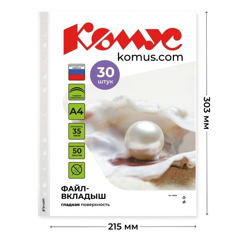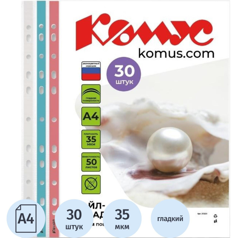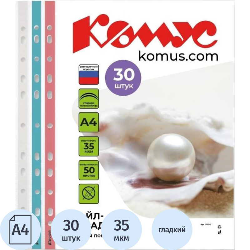 Файл-вкладыш 'Комус' из коллекции Русская серия предназначен для хранения и защиты документов. Формат А4. Изготовлен из полипропиленовой пленки (толщина 35 мкм). Внутренний размер 306х218 мм. Поверхность прозрачная, глянцевая. Универсальная боковая перфорация подходит для разных типов скоросшивателей. В упаковке содержится 30 файлов с перфорацией трех цветов (по 10 штук каждого(белый, синий, красный). Один файл-вкладыш вмещает до 30 листов стандартной плотности. Стоимость указана за упаковку. В рамках обновления дизайна упаковки с сохранением всех потребительских характеристик товара, допускается поставка данной продукции в двух вариантах дизайна упаковки.