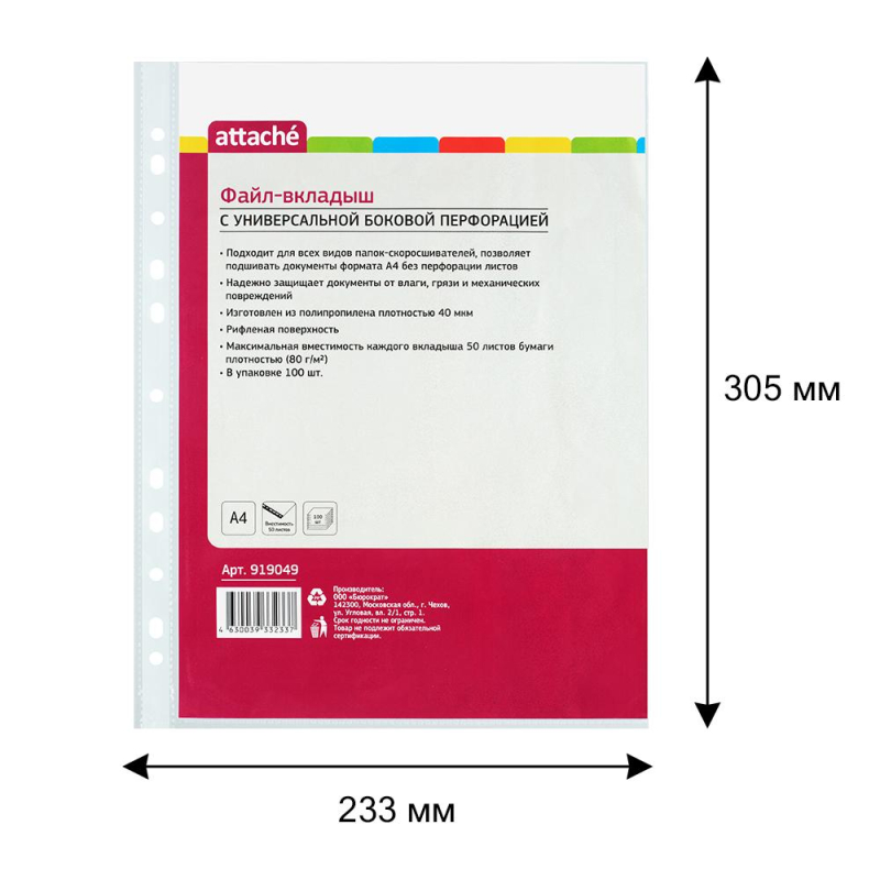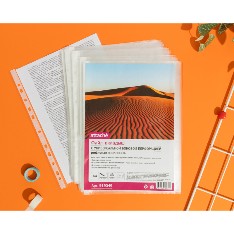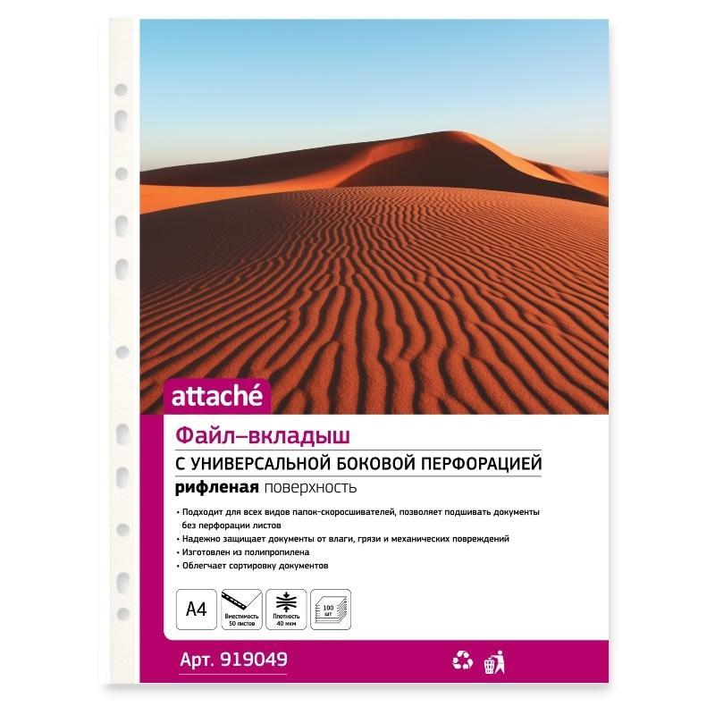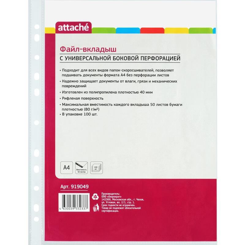 Файл-вкладыш Attache формата А4, предназначенный для хранения и защиты печатных документов. Поверхность прозрачная, рифленая. Изготовлен из полипропиленовой пленки (толщина 40 мкм). Внешний размер: 233+2x305+2 мм, внутренний размер: 217+2x303+2 мм. Боковая перфорация подходит для разных типов скоросшивателей. В упаковке содержится 100 файлов. Каждый файл-вкладыш вмещает около 50 листов стандартной плотности. Стоимость указана за упаковку. В рамках обновления дизайна упаковки с сохранением всех потребительских характеристик товара, допускается поставка данной продукции в двух вариантах дизайна упаковки.
