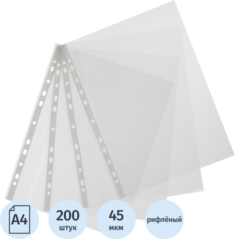 Файл-вкладыш Attache Economy формата А4, предназначенный для хранения и защиты печатных документов. Поверхность прозрачная, рифленая. Изготовлен из полипропиленовой пленки (толщина 45 мкм). Внешний размер: 233+2x305+2 мм, внутренний размер: 217+2x303+2 мм. Боковая перфорация подходит для разных типов скоросшивателей. В упаковке содержится 200 файлов. Каждый файл-вкладыш вмещает около 50 листов стандартной плотности. Стоимость указана за упаковку. Ultra пленка, выдерживает до мкм. Товар относится к ценовому сегменту "суперэконом". Имеет упрощенные характеристики и более простую упаковку. Отвечает основным требованиям потребления.Законодательные и технические документы: