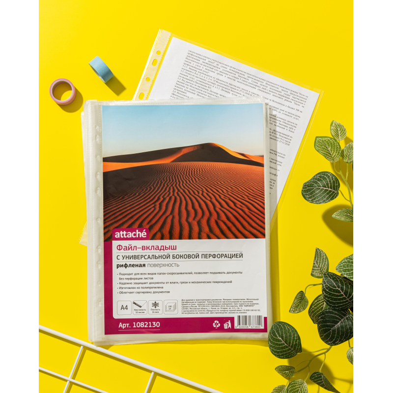 Файл-вкладыш Attache формата А4, предназначенный для хранения и защиты печатных документов. Поверхность рифленая. Позволяет копировать документы, не вынимая их из папки. Изготовлен из полипропиленовой пленки (толщина 35 мкм). Внешний размер: 233+2x305+2 мм, внутренний размер: 217+2x303+2 мм. Боковая перфорация подходит для разных типов скоросшивателей. В упаковке содержится 100 файлов. Каждый файл-вкладыш вмещает около 50 листов стандартной плотности. Стоимость указана за упаковку. В рамках обновления дизайна упаковки с сохранением всех потребительских характеристик товара, допускается поставка данной продукции в двух вариантах дизайна упаковки. Законодательные и технические документы