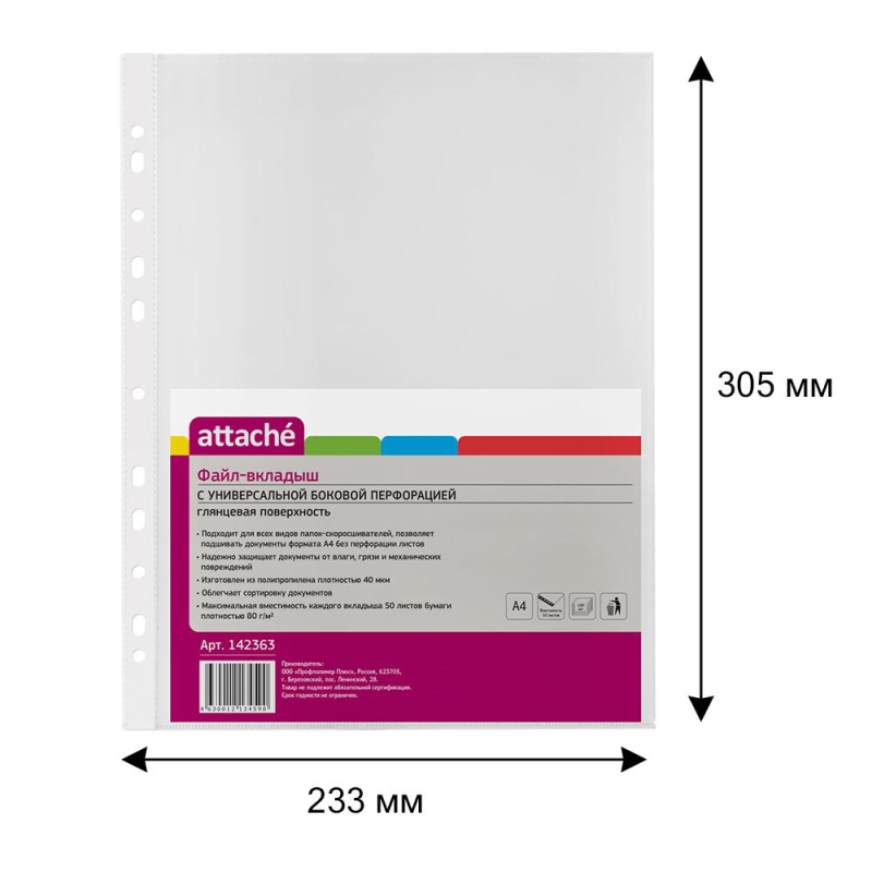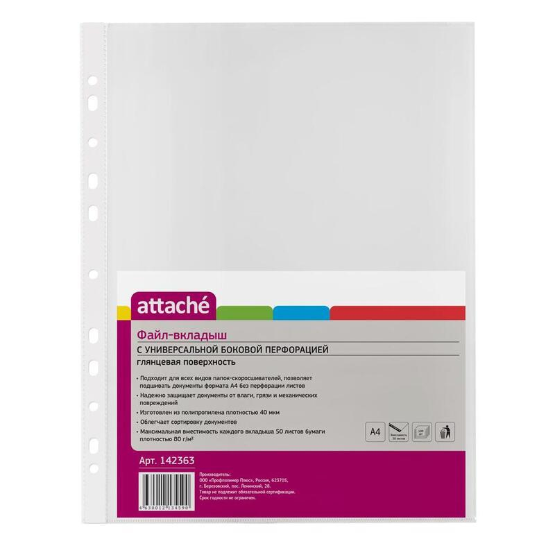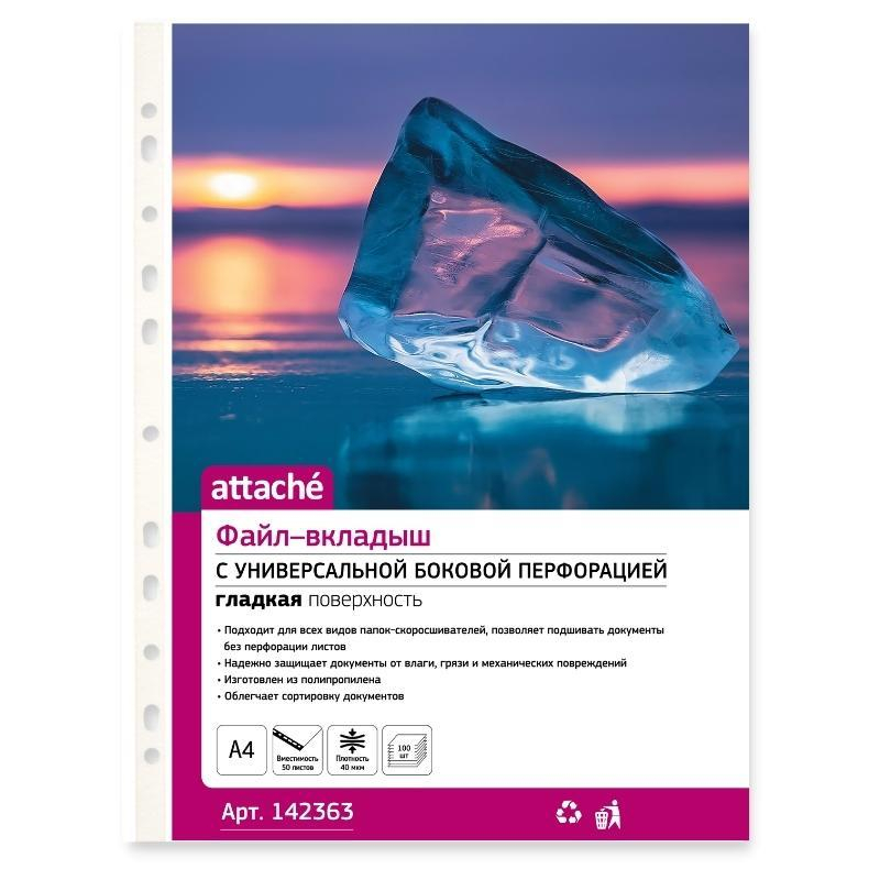 Файл-вкладыш Attache формата А4, предназначенный для хранения и защиты печатных документов. Поверхность прозрачная, глянцевая. Изготовлен из полипропиленовой пленки (толщина 40 мкм). Внешний размер: 233+2x305+2 мм, внутренний размер: 217+2x303+2 мм. Боковая перфорация подходит для разных типов скоросшивателей. В упаковке содержится 100 файлов. Каждый файл-вкладыш вмещает около 50 листов стандартной плотности. В рамках обновления дизайна упаковки с сохранением всех потребительских характеристик товара, допускается поставка данной продукции в двух вариантах дизайна упаковки. Стоимость указана за упаковку.