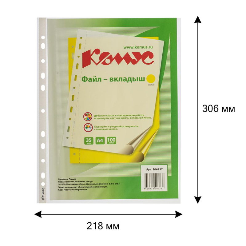 Файл-вкладыш Комус формата А4 предназначен для хранения и защиты документов. Изготовлен из полипропиленовой пленки желтого цвета (толщина 35 мкм). Внутренний размер 306х218 мм. Имеет прозрачную рифлёную поверхность. Боковая универсальная перфорация подходит для разных типов скоросшивателей. В упаковке содержится 100 файлов. Каждый файл-вкладыш вмещает до 50 листов стандартной плотности. Стоимость указана за упаковку.