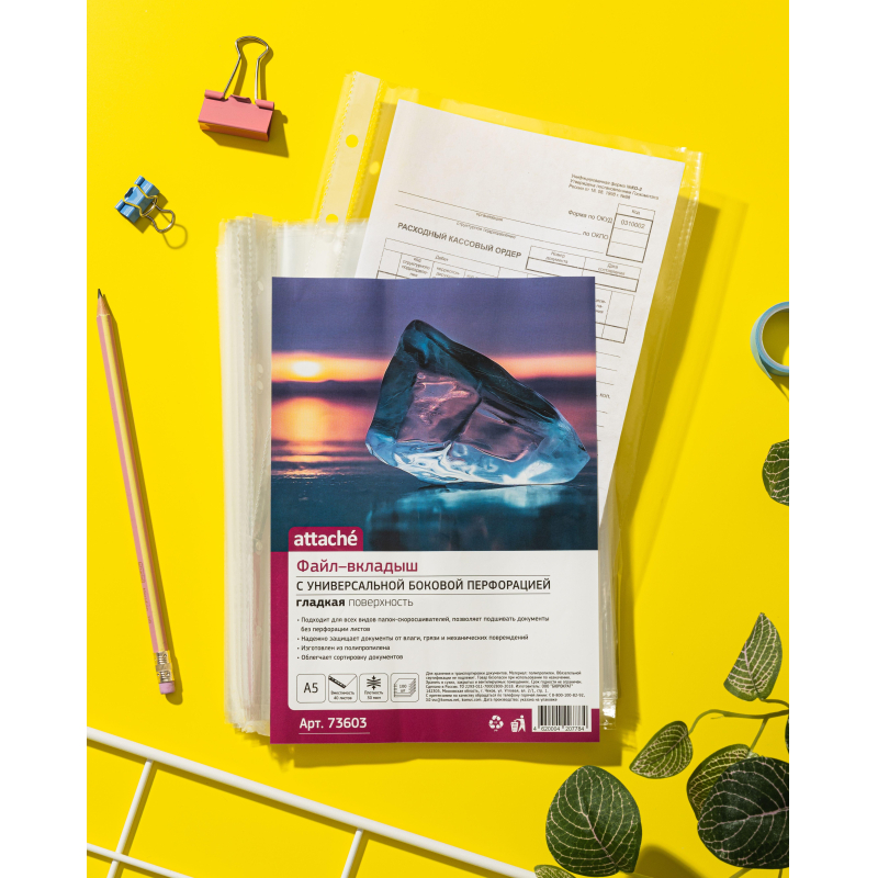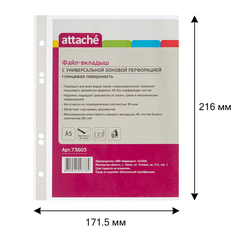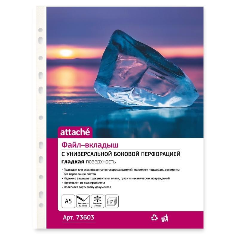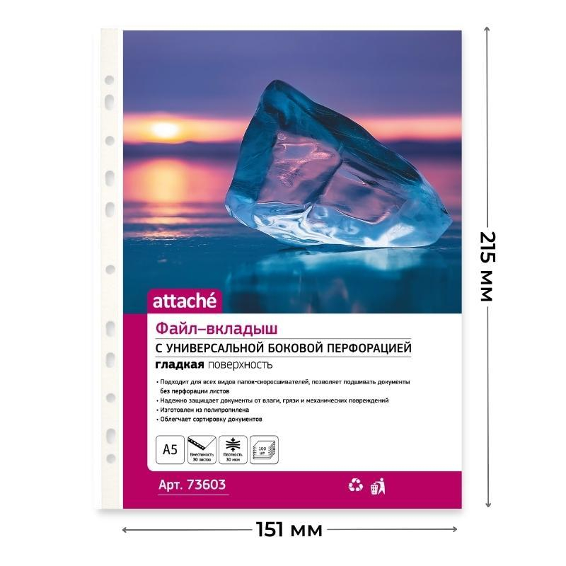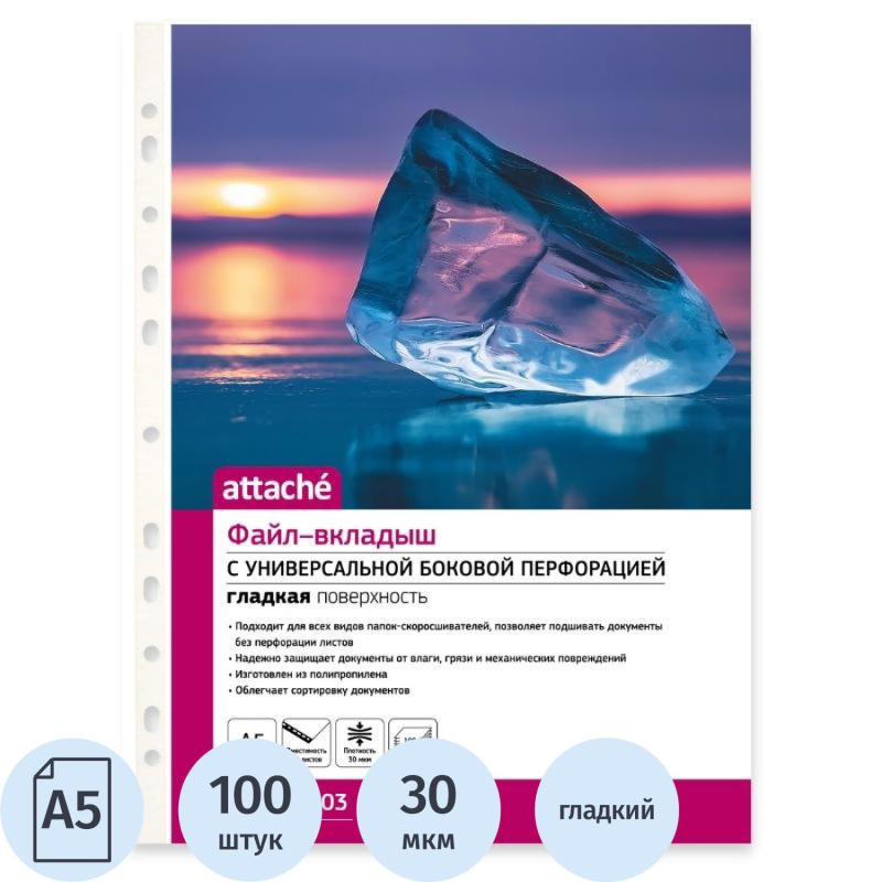Файл-вкладыш формата А5 предназначен для хранения и защиты документов. Изготовлен из полипропиленовой пленки (толщина 30 мкм). Внешний размер: 171,5+2x216+2 мм, внутренний размер: 156+2x214 +2 мм. Имеет прозрачную глянцевую поверхность. Боковая универсальная перфорация подходит для разных типов скоросшивателей. В упаковке содержится 100 файлов. Каждый файл-вкладыш формата А5 вмещает до 40 листов стандартной плотности. В рамках обновления дизайна упаковки с сохранением всех потребительских характеристик товара, допускается поставка данной продукции в двух вариантах дизайна упаковки. Законодательные и технические документы