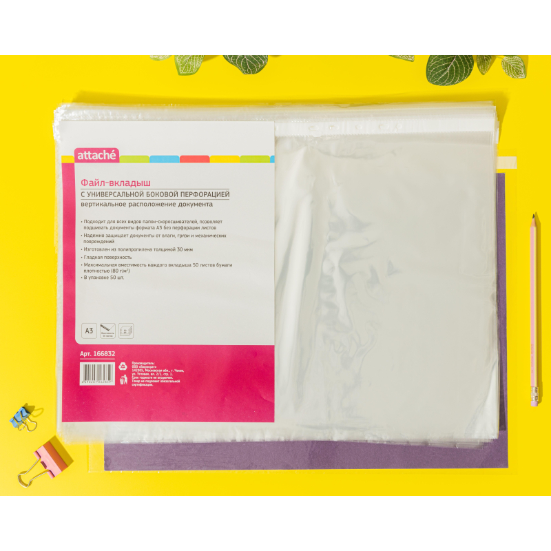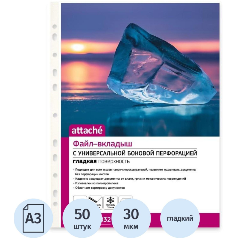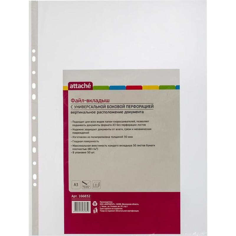 Файл-вкладыш Attache формата А3 предназначен для хранения и защиты документов. Ориентирован вертикально. Изготовлен из полипропиленовой пленки (толщина 30 мкм). Внешний размер: 320+2x425+2 мм, внутренний размер: 304,5+2x423 +2 мм. Поверхность глянцевая, прозрачная. Боковая универсальная перфорация подходит для разных типов скоросшивателей. В упаковке содержится 50 вертикальных файлов формата А3. Каждый файл-вкладыш вмещает до 30 листов стандартной плотности. Стоимость указана за упаковку. В рамках обновления дизайна упаковки с сохранением всех потребительских характеристик товара, допускается поставка данной продукции в двух вариантах дизайна упаковки. Законодательные и технические документы