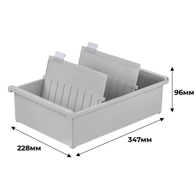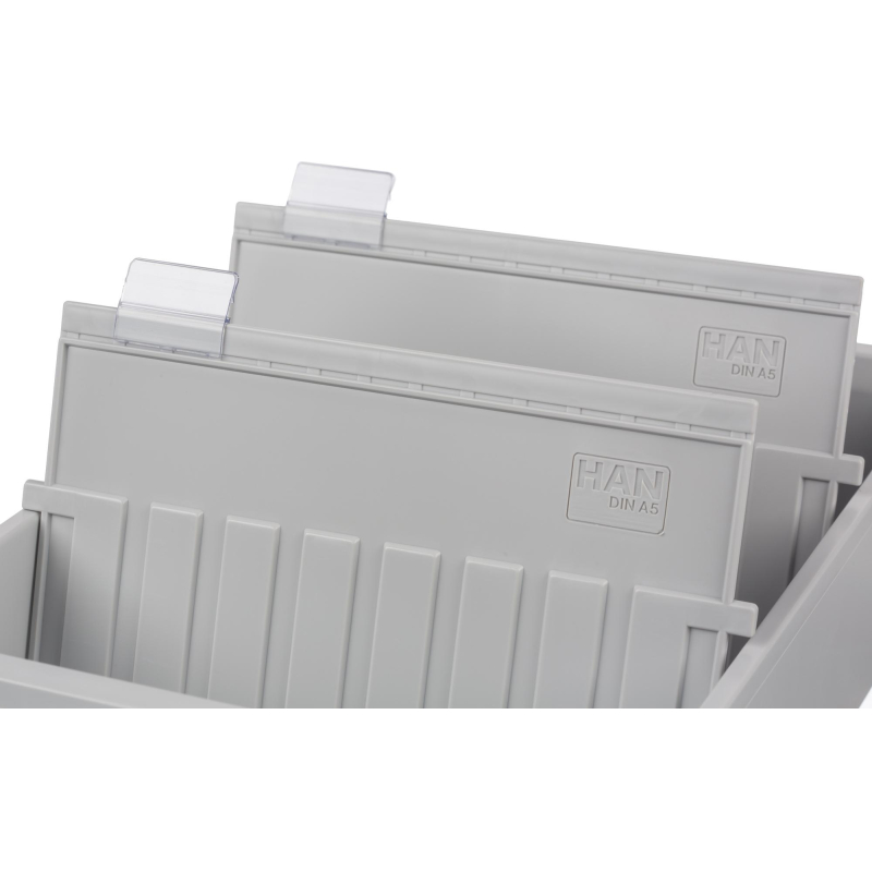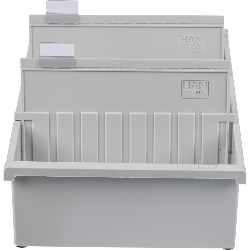 Открытая горизонтальная картотека формата А5 для хранения 1300 картонных карточек.<br />Изготовлена из жесткого пластика серого цвета.<br />В комплекте 2 пластиковых разделителя серого цвета и 2 прозрачных индексных окна(арт.63669).<br />Размеры картотеки: 347x228x96 мм<br />Размер карточек: 210x148 мм.<br />Возможна установка до 26 разделителей (арт. 57561).