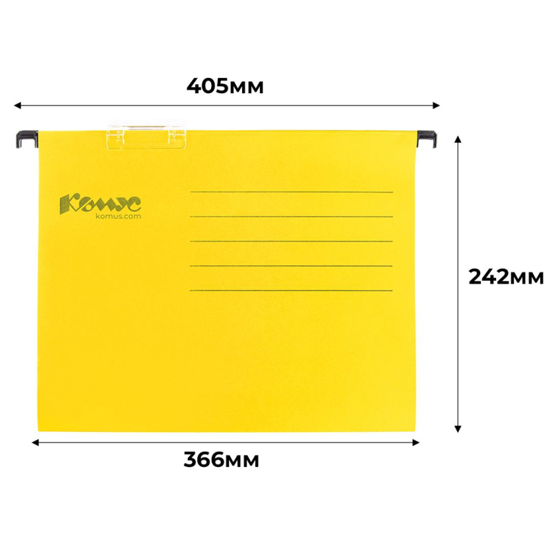 Предназначены для организации хранения документов в подвешиваемом положении. Изготовлены из картона 224 г/кв.м. Металлические крючки в пластиковом корпусе. Передвижной табулятор из жесткого пластика с бумажной вставкой для маркировки. Размер табулятора 7x1 см. Размер бумажного вкладыша 6.5x1 см. Размер папки, включая крючки 405x242 мм; без учета крючков 366x242 мм. Формат Foolscap. В упаковке 25 папок и 25 табуляторов. Цвет желтый. Форма папки V-образная. Вместимость 200 листов (максимальный выдерживаемый вес 2 кг). Скоросшиватель для подшивки документов - отсутствует. Рекомендуется хранение папок в тележке, картотеке и других системах хранения.