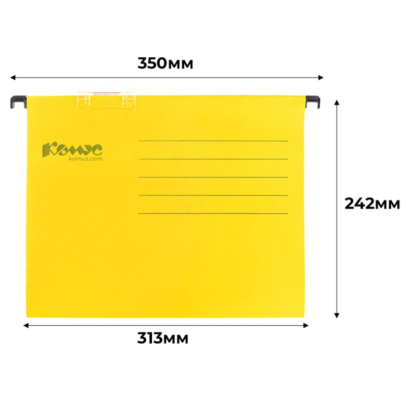 Предназначены для организации хранения документов в подвешиваемом положении. Изготовлены из картона 224 г/кв.м. Металлические крючки в пластиковом корпусе. Передвижной табулятор из жесткого пластика с бумажной вставкой для маркировки. Размер табулятора 7x1 см. Размер бумажного вкладыша 6.5x1 см. Размер папки, включая крючки 350х242 мм; без учета крючков 313х242 мм. Формат А4. В упаковке 25 папок и 25 табуляторов. Цвет желтый. Форма папки V-образная. Вместимость 200 листов (максимальный выдерживаемый вес 2 кг). Скоросшиватель для подшивки документов - отсутствует. Рекомендуется хранение папок в тележке, картотеке и других системах хранения.