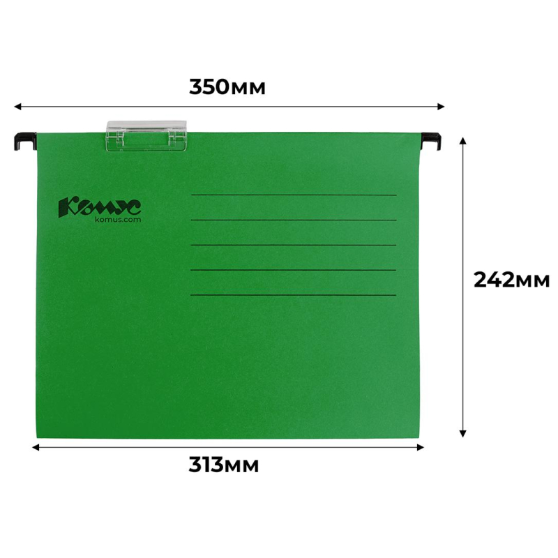 Предназначены для организации хранения документов в подвешиваемом положении. Изготовлены из картона 224 г/кв.м. Металлические крючки в пластиковом корпусе. Передвижной табулятор из жесткого пластика с бумажной вставкой для маркировки. Размер табулятора 7x1 см. Размер бумажного вкладыша 6.5x1 см. Размер папки, включая крючки 350х242 мм; без учета крючков 313х242 мм. Формат А4. В упаковке 25 папок и 25 табуляторов Цвет зеленый. Форма папки V-образная. Вместимость 200 листов (максимальный выдерживаемый вес 2 кг). Скоросшиватель для подшивки документов - отсутствует. Рекомендуется хранение папок в тележке, картотеке и других системах хранения.