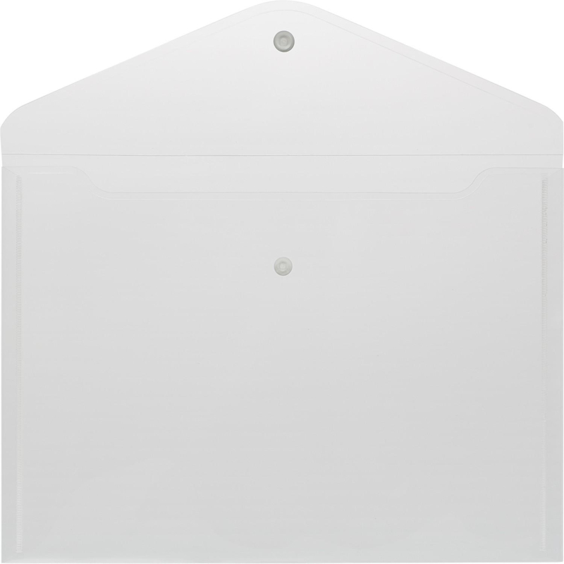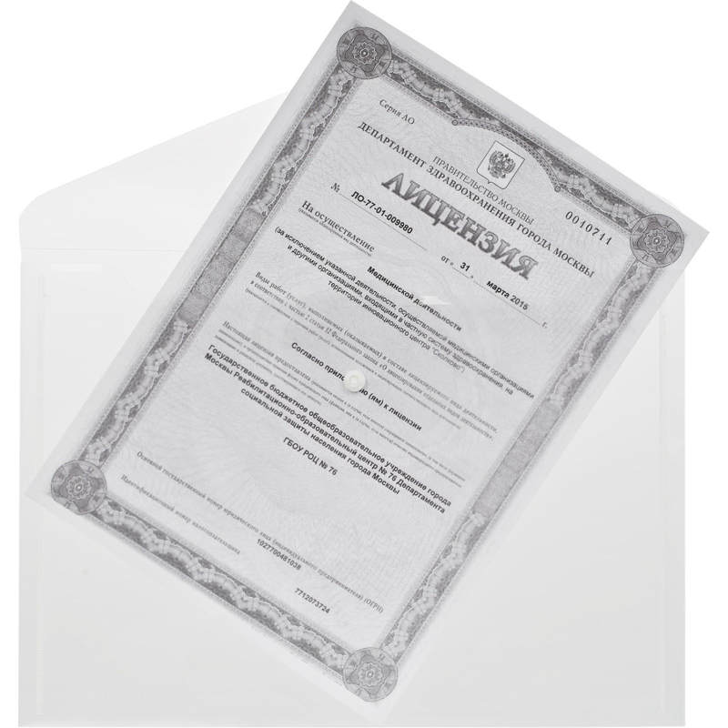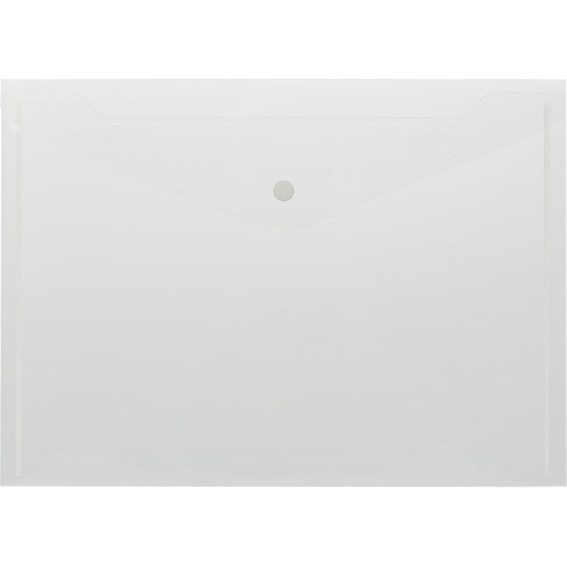 Папка-конверт формата А4 изготовлена из прозрачного пластика толщиной 0,18 мм бесцветного цвета. Из-за высокой плотности папки создается небольшой эффект матовости. Внешний размер составляет 236x330 мм. Закрывается на кнопку. Удобна для хранения и переноски документов, предотвращает их смятие и загрязнение. Вмещает до 120 листов стандартной плотности.
