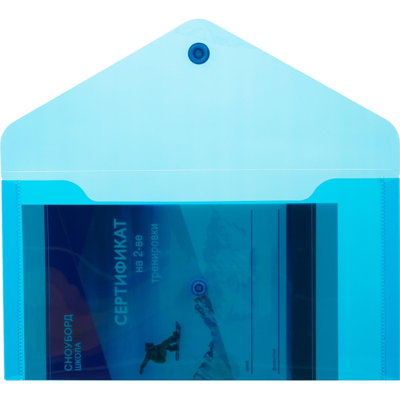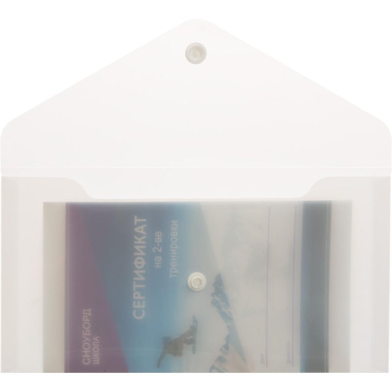 Папка-конверт размером формата С6 изготовлена из прозрачного пластика толщиной 0,18 мм. Закрывается на кнопку. Вмещает до 120 листов. Удобна для хранения и переноски документов, предотвращает их смятие и загрязнение. Размер: 119х224 мм.