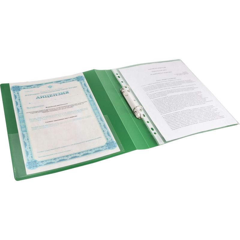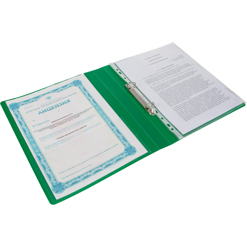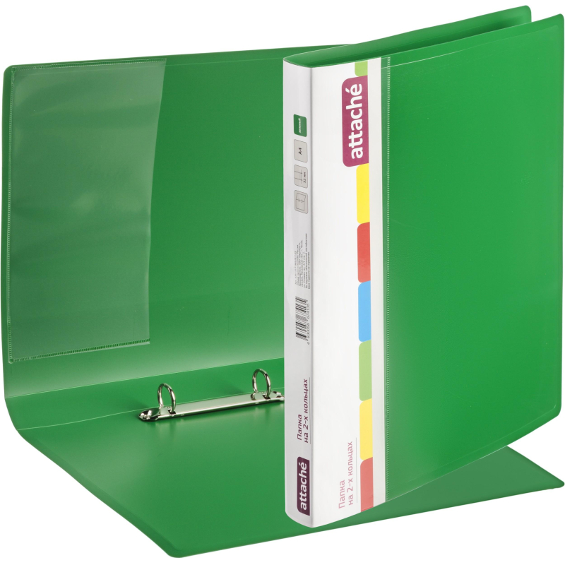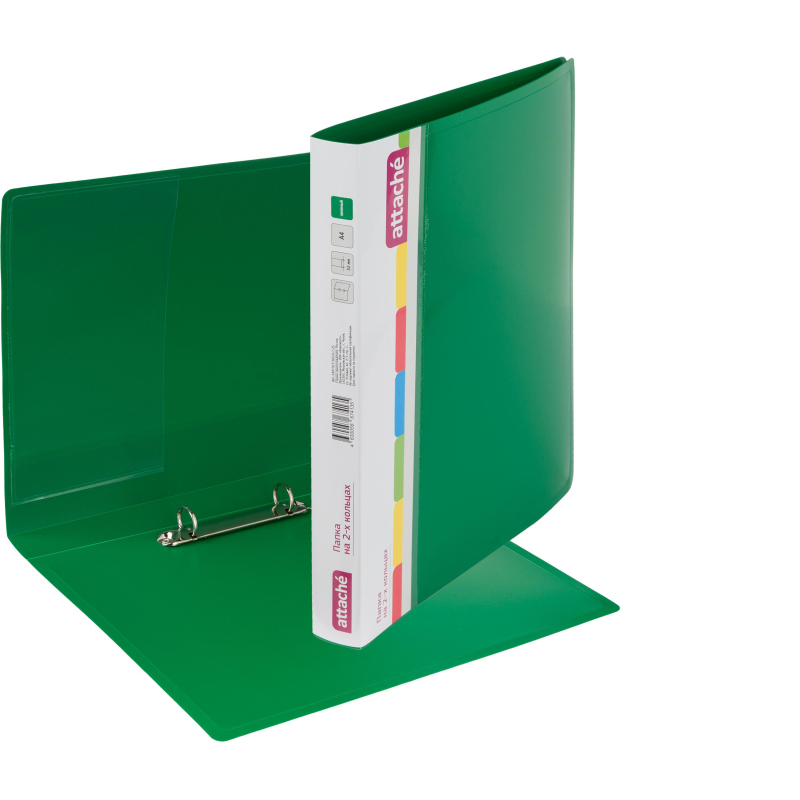 Папка на кольцах рекомендуются как для временного, так и длительного хранения, систематизации, архивирования документов. Такие папки используются в работе офисными сотрудниками различных специальностей, направлений, должностей. Можно использовать для домашних документов. Папка на двух кольцах Attache изготовлена из листового полипропилена толщиной 0,7 мм зеленого цвета. Формат А4. Снабжена механизмом на двух O-кольцах. Диаметр кольца - 25 мм. На внутренней стороне обложки есть прозрачный карман для документов. Корешок шириной 32 мм имеет карман для сменной этикетки. Папка на кольцах вмещает до 200 листов стандартной плотности.