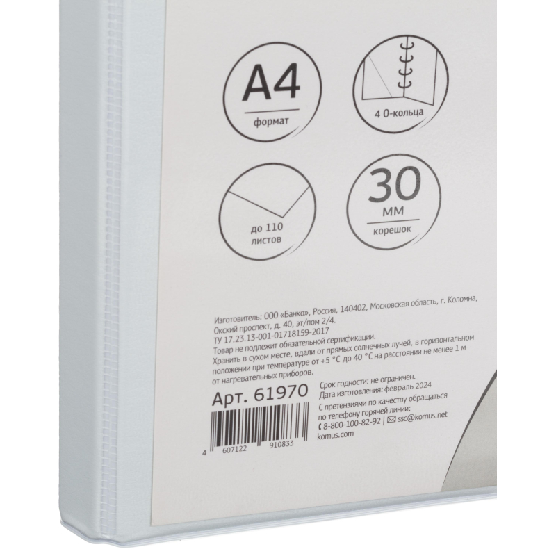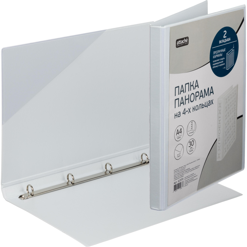 Папка Панорама изготовлена из прочного картона толщиной 1.75 мм, покрытого с двух сторон пленкой ПВХ белого цвета. Формат А4, ориентирован вертикально. Оснащены механизмом на четырех О-образных кольцах диаметром 16 мм. Вмещают до 110 листов стандартной плотности. Корешок шириной 30 мм имеет прозрачный карман для сменной этикетки. На лицевой и оборотной сторонах папки для презентаций расположены карманы А4 для размещения титульного листа и прочей информации. На внутренней стороне обложки - карман для документов.С начала 2024 года прекращено производство всех товаров ТМ Bantex (Хамелин А/С, Дания). Все артикулы продукции бренда Bantex (после реализации остатков, произведенных до 31.12.2023) будут переведены на продукцию бренда Attache Selection, с сохранением всех потребительских характеристик и свойств товаров. На переходный период допускается поставка данной продукции в двух вариантах дизайна упаковки.Законодательные и технические документы: