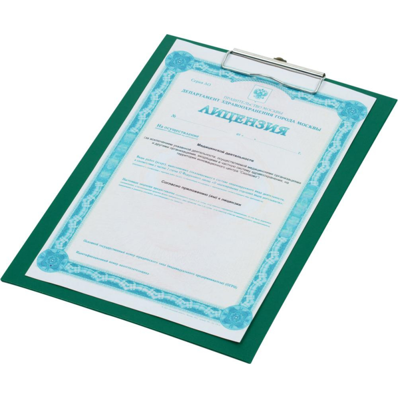 Планшет формата А4 (226x316 мм) изготовлен из плотного картона ,сверху покрыт ПВХ зеленого цвета. Позволяет комфортно работать с документами на весу. Металлический прижим надежно удерживает листы и файлы. Законодательные и технические документы