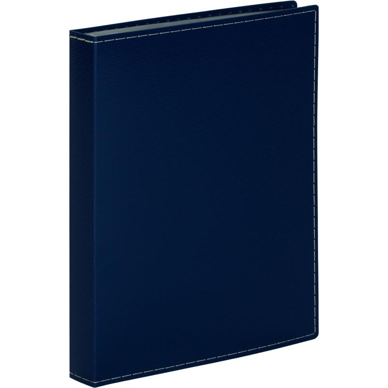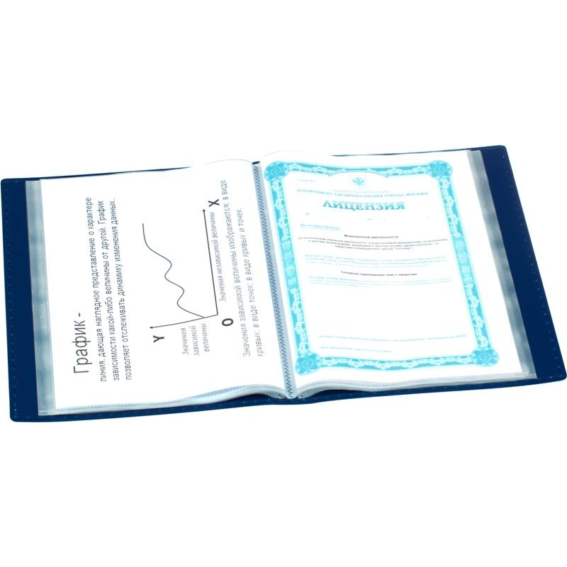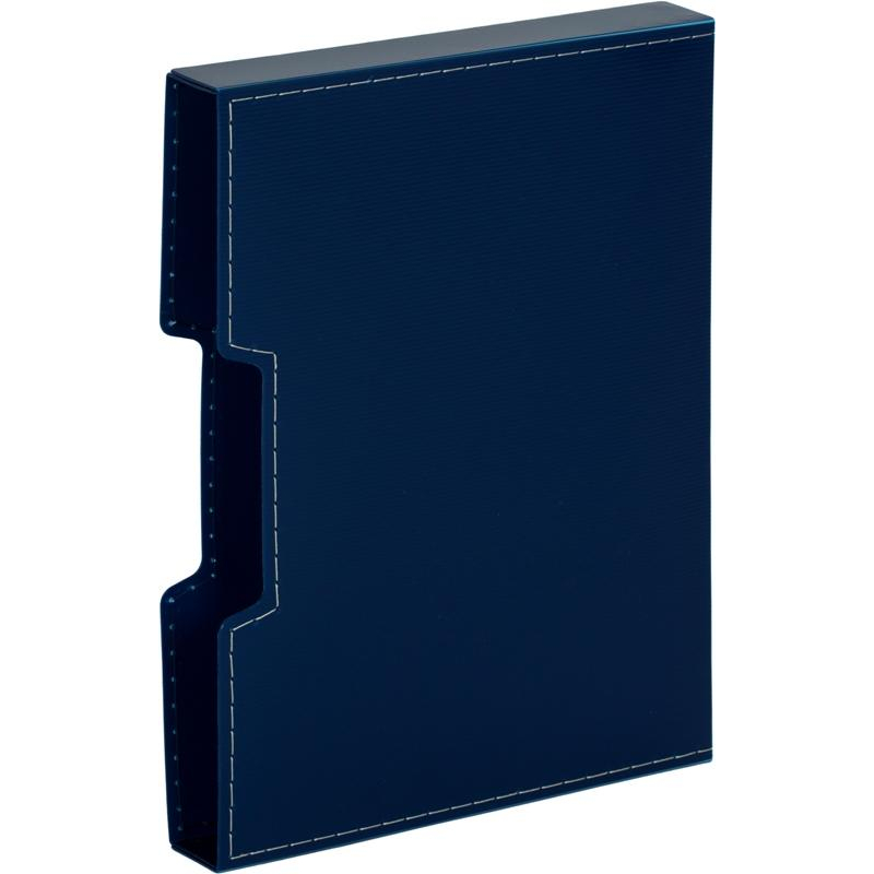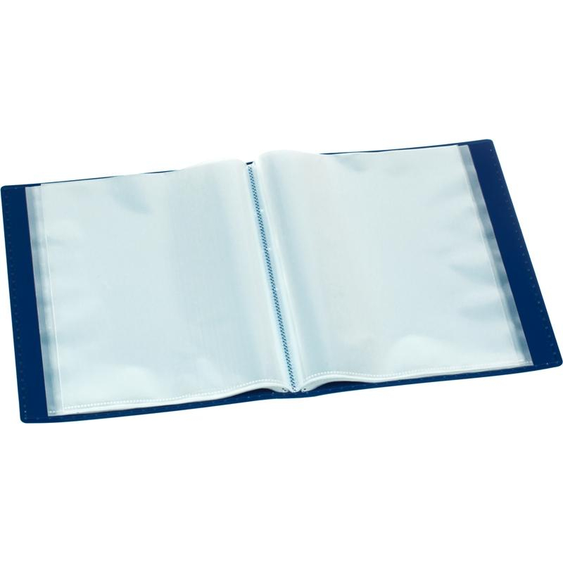 Удобная и практичная файловая папка формата А4 изготовлена из жесткого полипропилена синего цвета толщиной 1 мм. Имеет 80 несъемных прозрачных вкладышей, в каждый из которых можно вложить до двух листов. Подходит для хранения и демонстрации документов на презентациях, совещаниях, создания портфолио. Папка с файлами вложена в пластиковый бокс, который позволяет ставить ее на стол. В боксе предусмотрены выемки для легкого извлечения папки. Оба предмета декорированы окантовкой в виде прострочки.Плотность файлов 35 мкм.