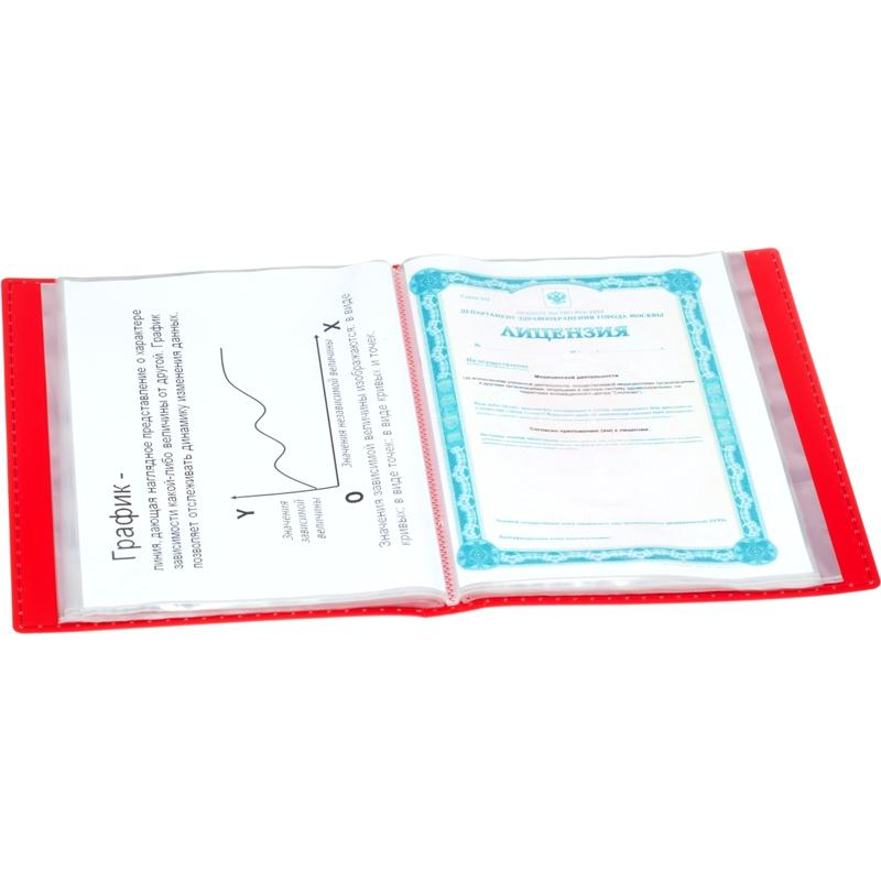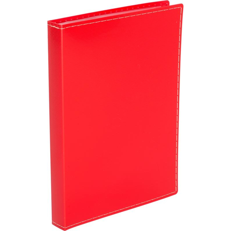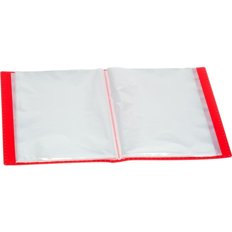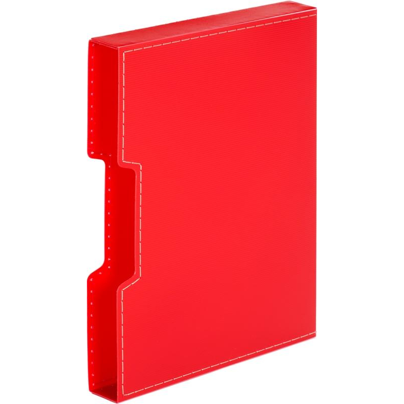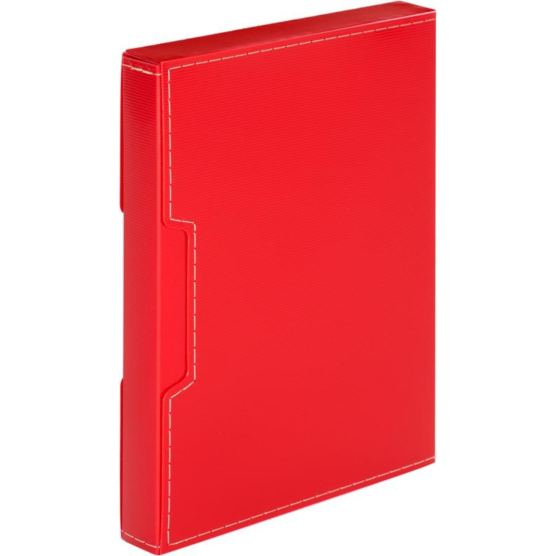 Удобная и практичная файловая папка формата А4 изготовлена из жесткого полипропилена красного цвета толщиной 1 мм. Имеет 100 несъемных прозрачных вкладышей, в каждый из которых можно вложить до двух листов. Подходит для хранения и демонстрации документов на презентациях, совещаниях, создания портфолио. Папка с файлами вложена в пластиковый бокс, который позволяет ставить ее на стол. В боксе предусмотрены выемки для легкого извлечения папки. Оба предмета декорированы окантовкой в виде прострочки. Плотность файлов 35 мкм.