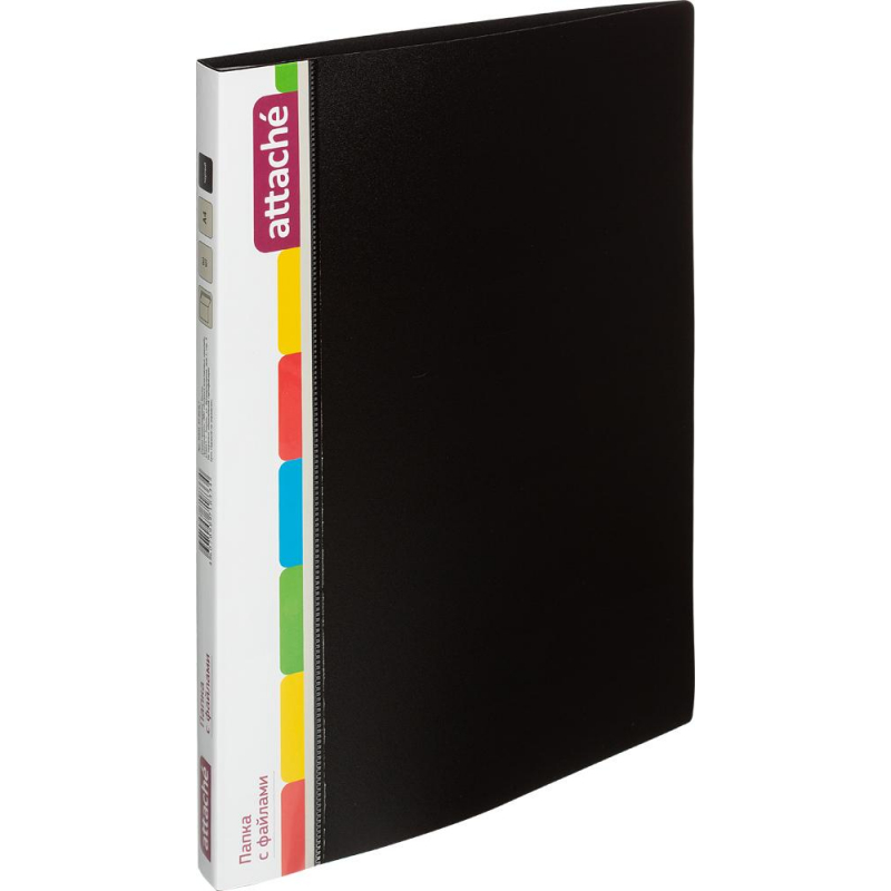 Папка с файлами Attache предназначена для хранения материалов и документов формата А4, требующих упорядоченности и наглядного обзора: отчетов, презентаций, коммерческих и персональных портфолио. Изготовлена из пластика толщиной 0,7 мм черного цвета, имеет 60 прозрачных вкладышей, а также карман на корешке для сменной этикетки. Вмещает до 120 листов стандартной плотности. Преимуществом файловой папки является надежная сохранность документов в отличном состоянии без предварительной перфорации. Плотность файлов 25 мкм.